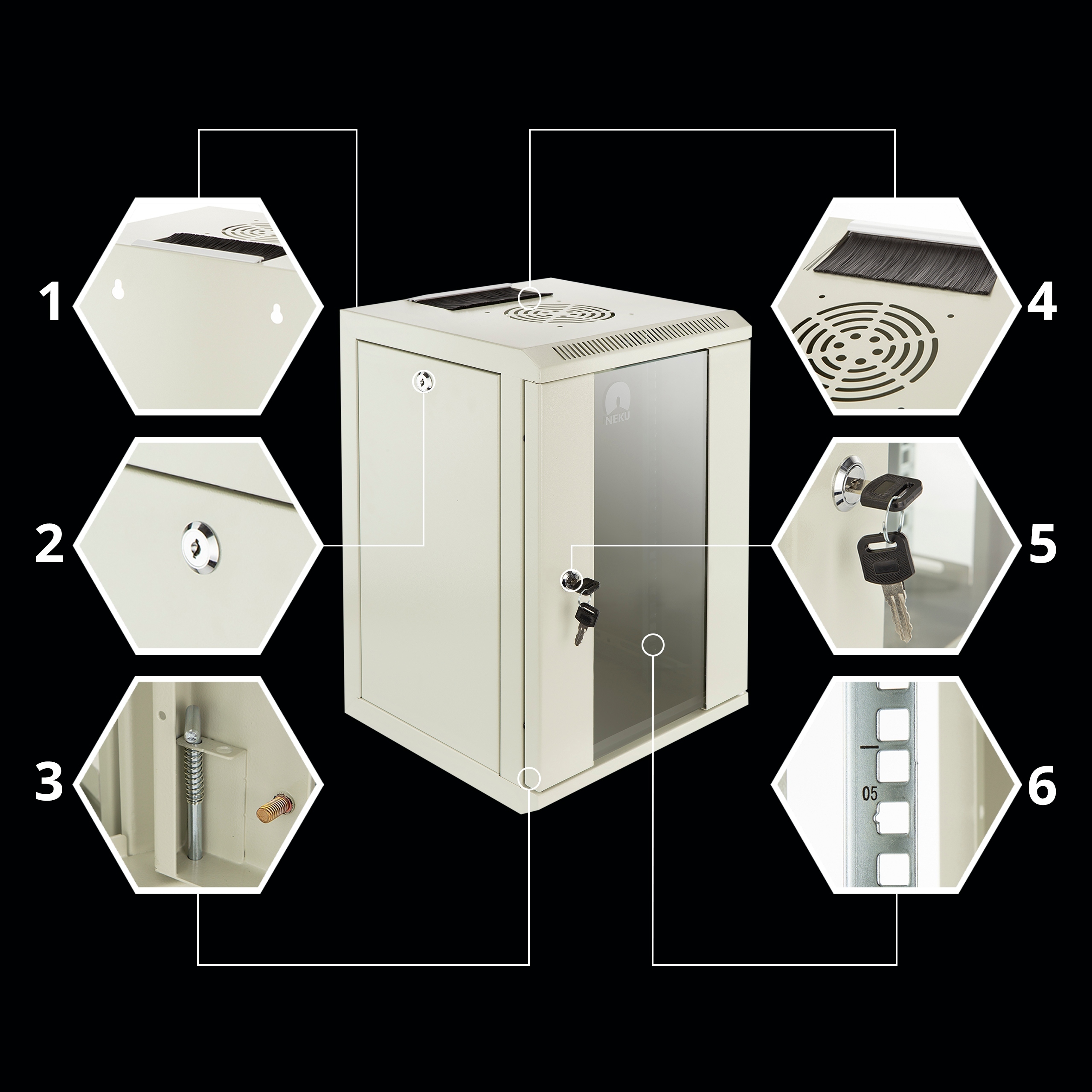 В новой серии шкафовПодвесные модели NEKU доступны в размерах 6U, 9U, 12U черного и серого цвета.