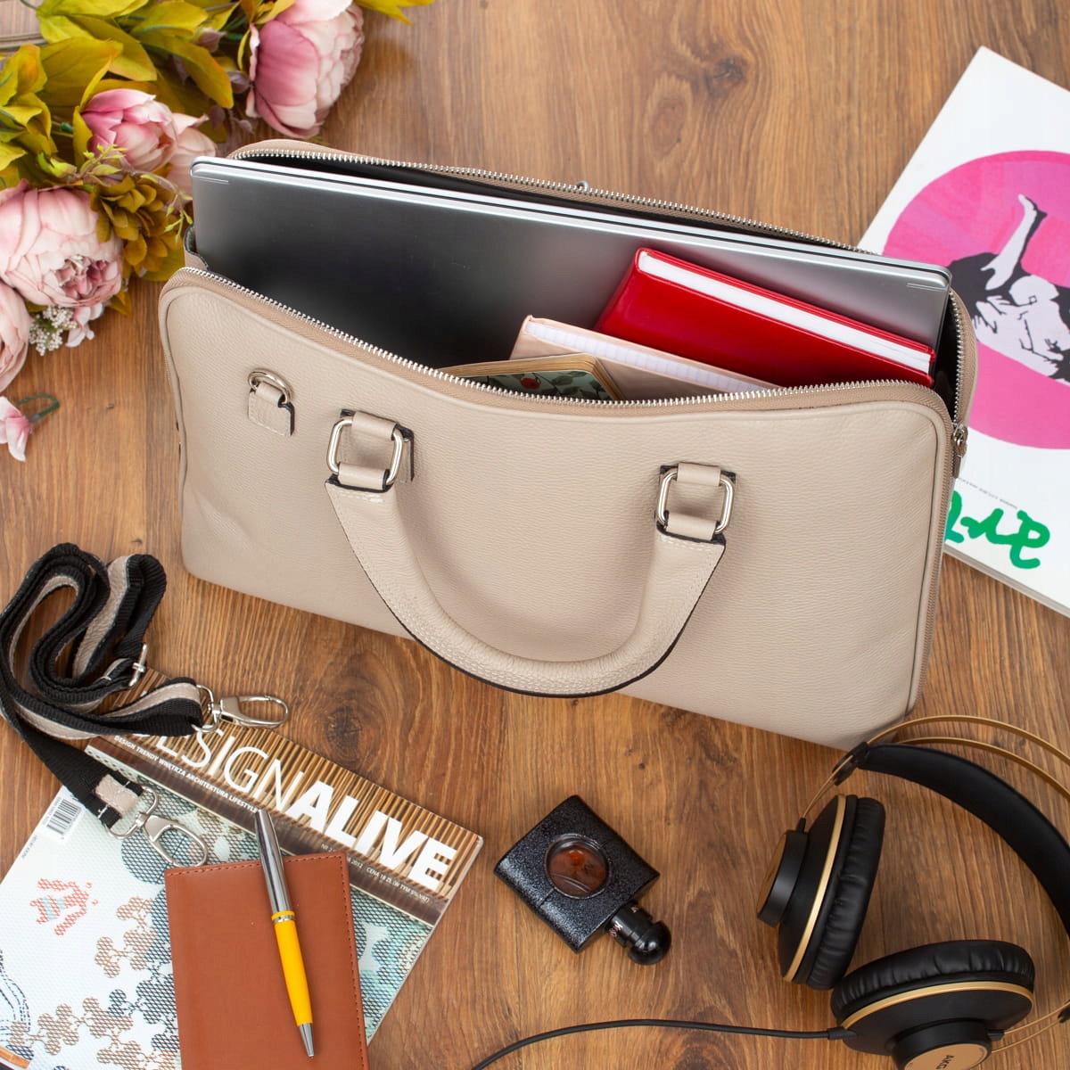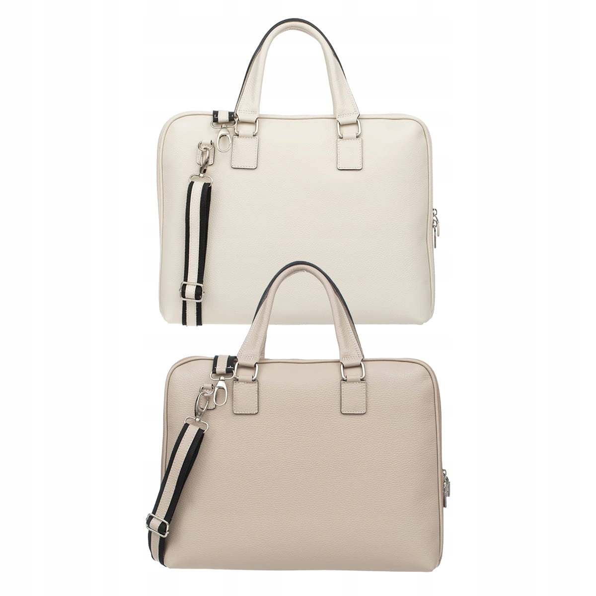 Elegancka Torba damska na laptop, wykonana z włoskiej skóry licowej. W torbie zmieści się laptop o przekątnej ekranu do 17,3 cala wraz z dokumentami, teczką, telefonem czy tabletem. Torbę można nosić w ręku lub na ramieniu za pomocą odpinanego paska.
