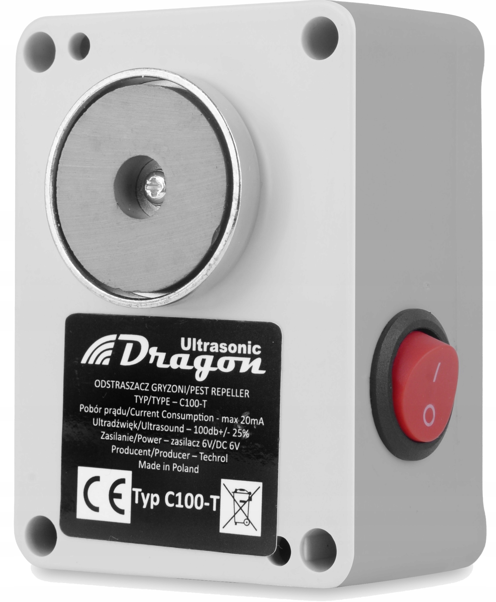 ✅ Montaż bez problemów: Model C100T wyposażono w silny uchwyt magnetyczny, który umożliwia szybki montaż na powierzchniach metalowych, takich jak rury czy elementy konstrukcyjne. Dodatkowo w zestawie znajduje się specjalna metalowa kotwa, którą można przykręcić w miejscach pozbawionych elementów metalowych i zamocować odstraszacz za pomocą magnesu.