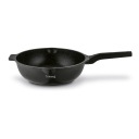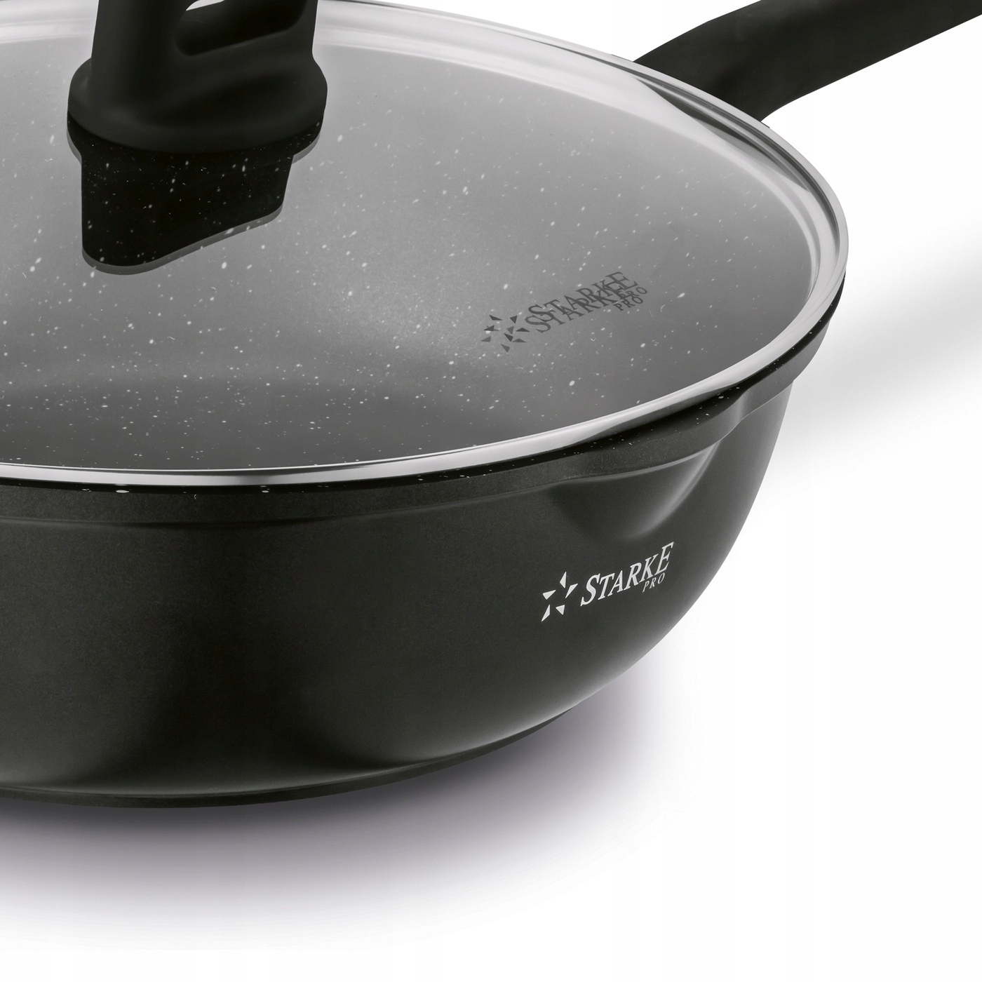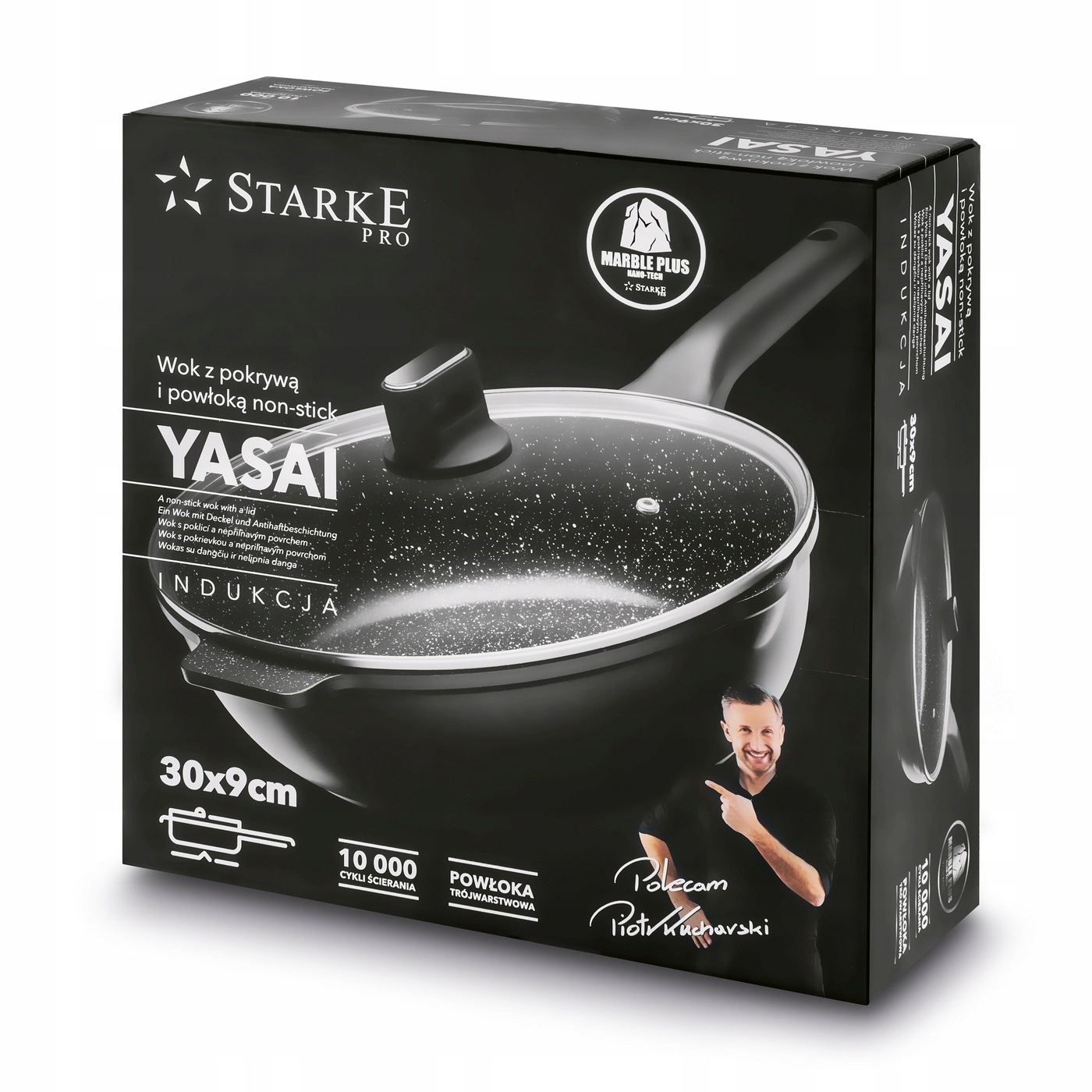 Wok Starke Pro Yasai 30 cm to solidne naczynie do intensywnej, codziennej pracy w kuchni. Odlany aluminiowy korpus zapewnia szybkie i równomierne nagrzewanie, a powłoka Marble Plus wytrzymująca 10 000 cykli ścierania gwarantuje wieloletnią odporność na zużycie. To aż 5 razy więcej niż oferują klasyczne powłoki non stick. Dzięki temu wok umożliwia smażenie niemal bez tłuszczu i ogranicza ryzyko przywierania. Zestaw obejmuje szklaną pokrywę z odpowietrznikiem i stalowym rantem, a uchwyt soft touch zapewnia bezpieczeństwo w trakcie pracy. Model działa na kuchenkach indukcyjnych, gazowych, elektrycznych i ceramicznych, a dzięki praktycznym wylewkom łatwo odlejesz płyny. To trwałe, wygodne w użyciu naczynie, które pozwoli przygotować duże porcje dań i usprawni gotowanie w każdej domowej kuchni.