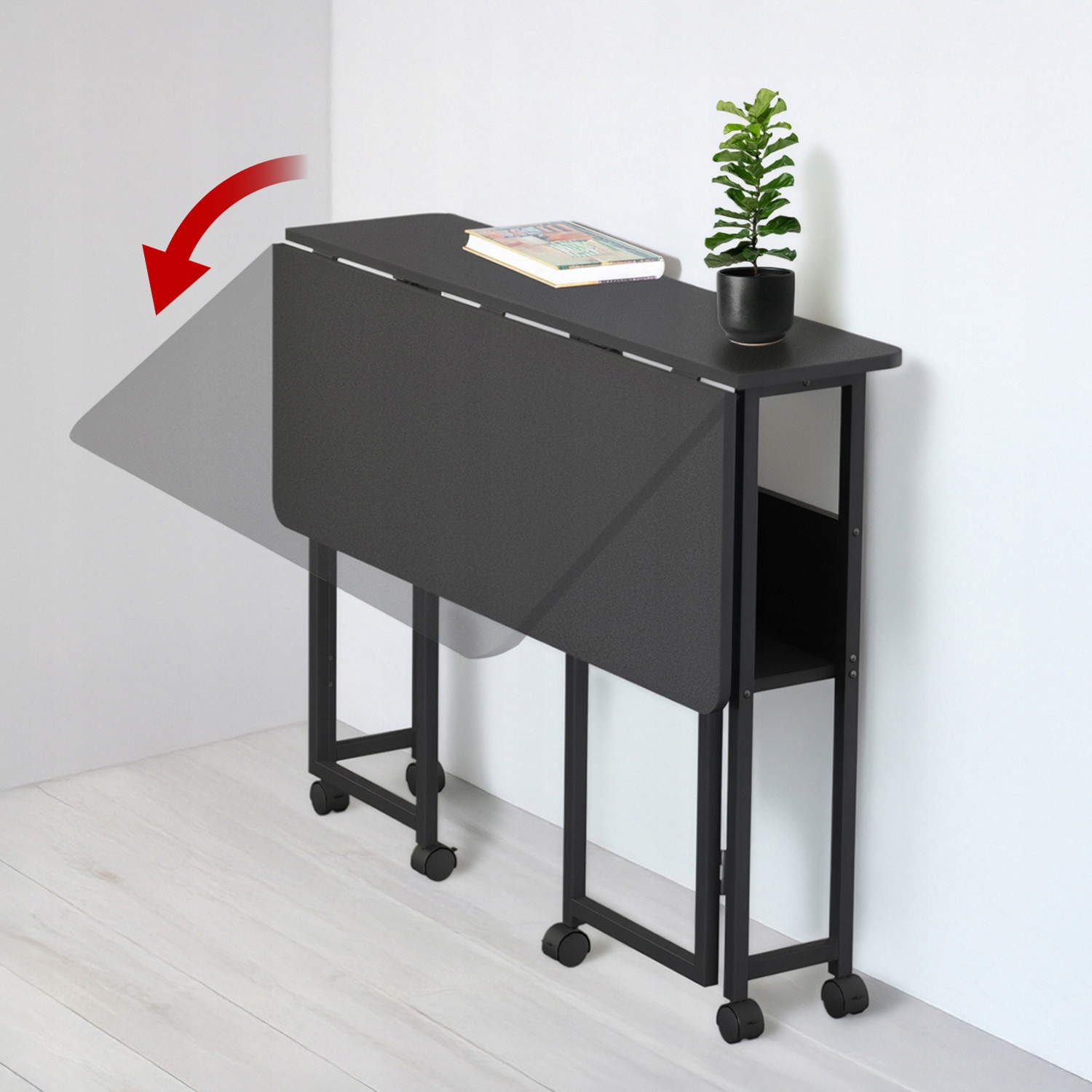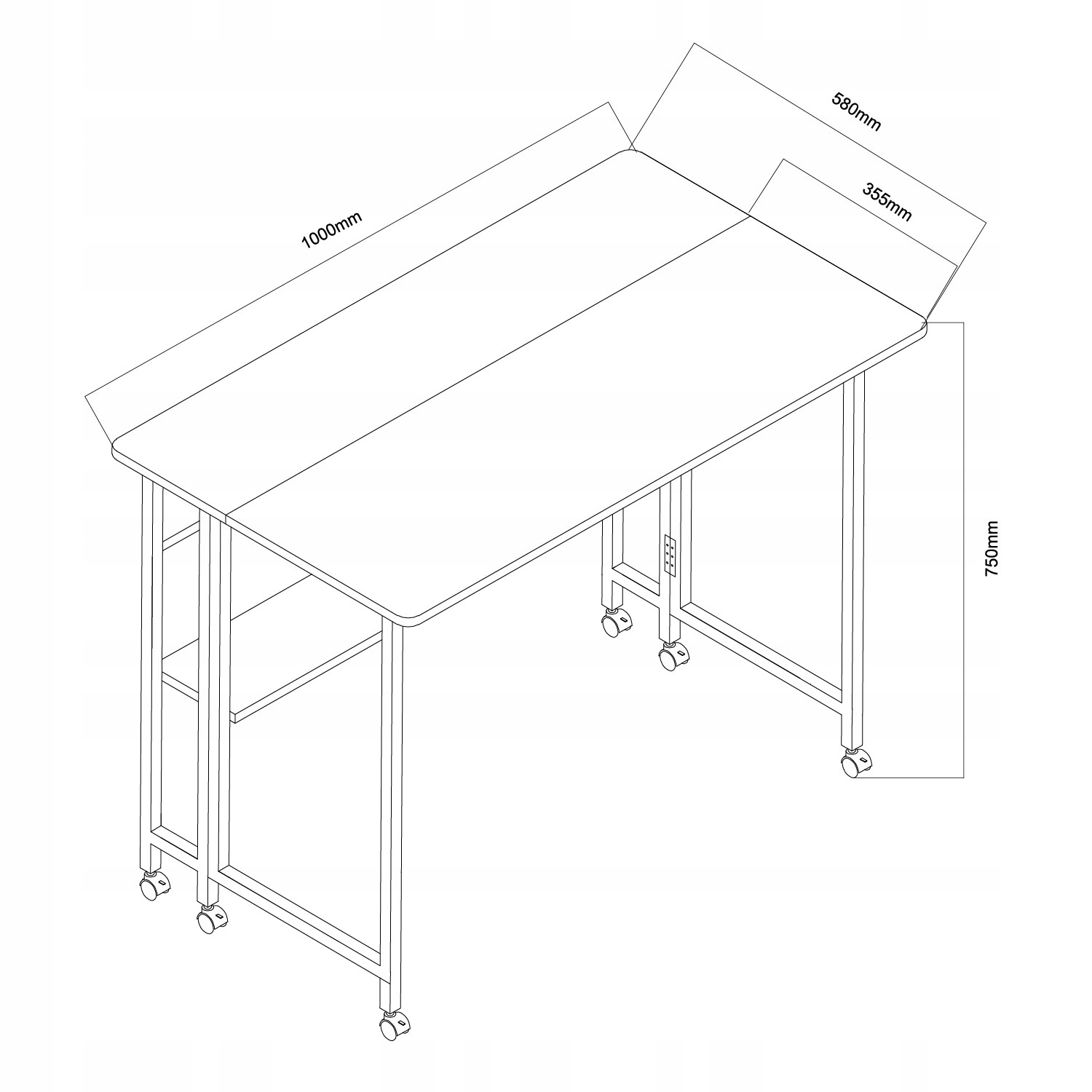 Przemyślana konstrukcja pozwala w kilku prostych krokach zmienić biurko pełnowymiarowe w kompaktowy mebel zajmujący niewiele miejsca. Dzięki sześciu kółkom z blokadą można łatwo przesuwać biurko w dowolne miejsce, a po zatrzymaniu unieruchomić je w wybranej pozycji.