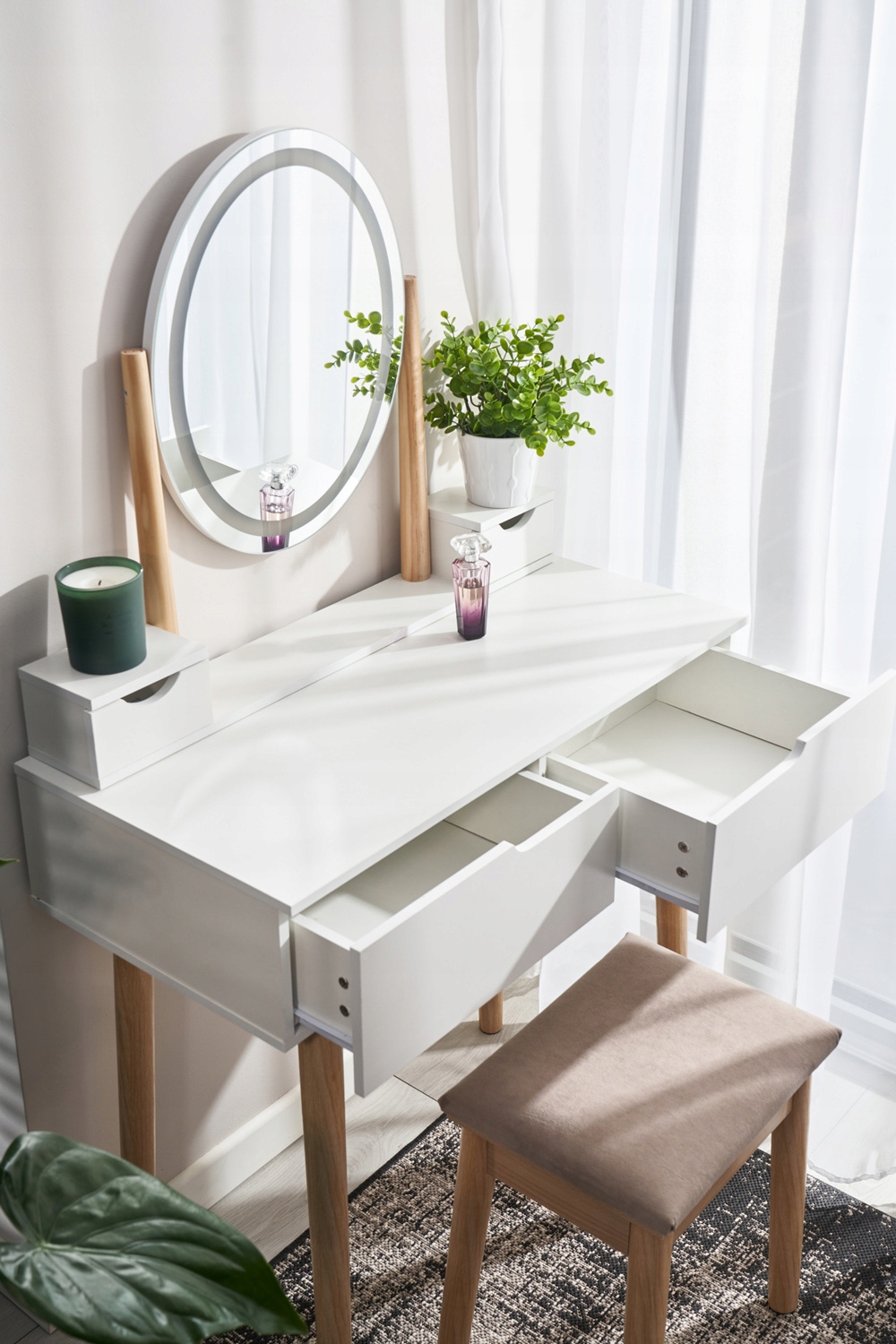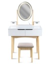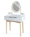 Toaletka wyposażona jest w lustro z energooszczędnym oświetleniem LED, które daje jasne, neutralne światło. Dzięki temu Twój makijaż będzie zawsze równomierny, a kolory idealnie odwzorowane – niezależnie od pory dnia czy warunków oświetleniowych