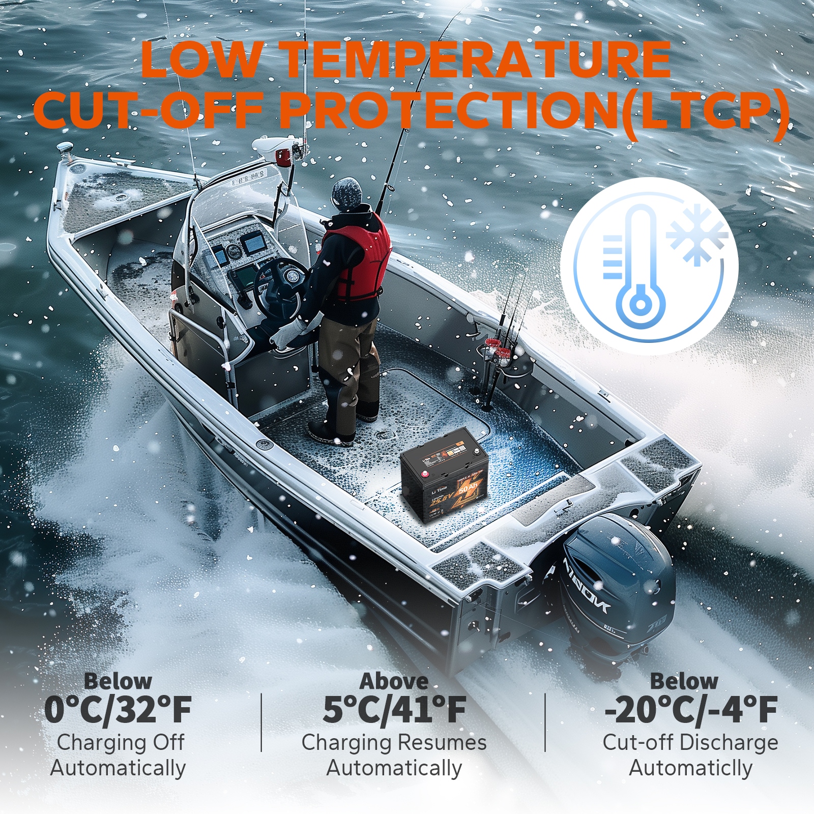 Dzięki ochronie przed odcięciem w niskiej temperaturze akumulator litowy silnika trollingowego LiTime 24 V 25 Ah wstrzymuje ładowanie poniżej 32 ℉, odcina rozładowywanie poniżej-4 ℉ i wznawia bezpiecznie powyżej 5 ℉. Może chronić baterię przed uszkodzeniem przez zimno, dzięki czemu możesz skupić się na połowach, a nie na warunkach.