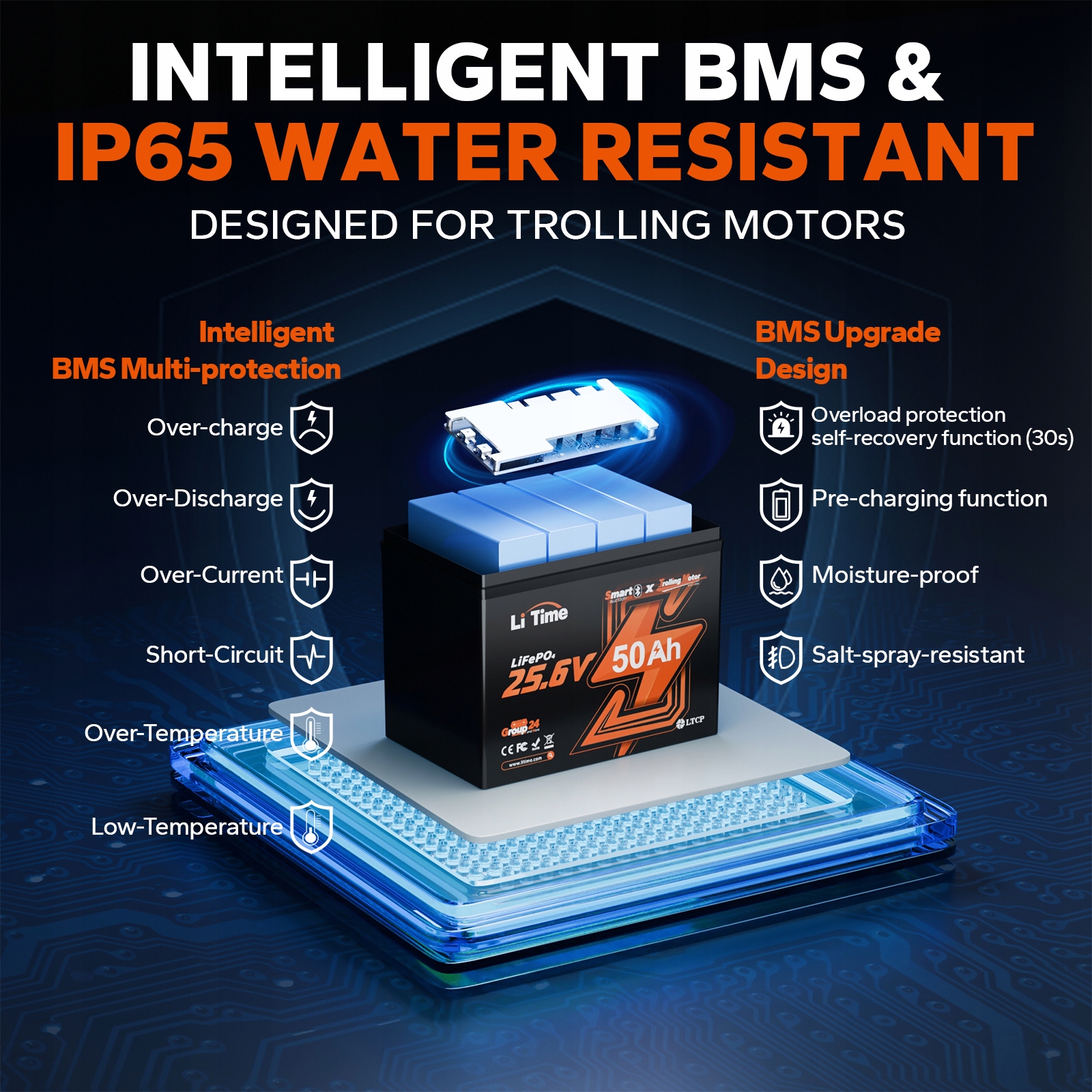 Specjalnie zaprojektowany dla silników oporowych 70–100 funtów, akumulator LiTime 24V 50Ah LiFePO4 zapewnia płynne, niezawodne działanie na wodzie. Dzięki wodoodporności IP65 i ciągłemu rozładowaniu 60A (30 minut) jest zbudowany dla wędkarzy, którzy wymagają całodziennej mocy, bez luzu i zmartwień.