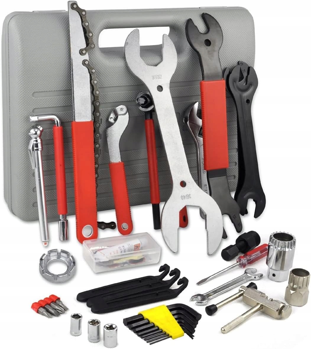 Полный набор инструментов для ремонта и обслуживания велосипеда-целых 44 тщательно подобранных элемента в практичный, прочный чемодан. Незаменим для любого велосипедиста - от любителя до профессионала!