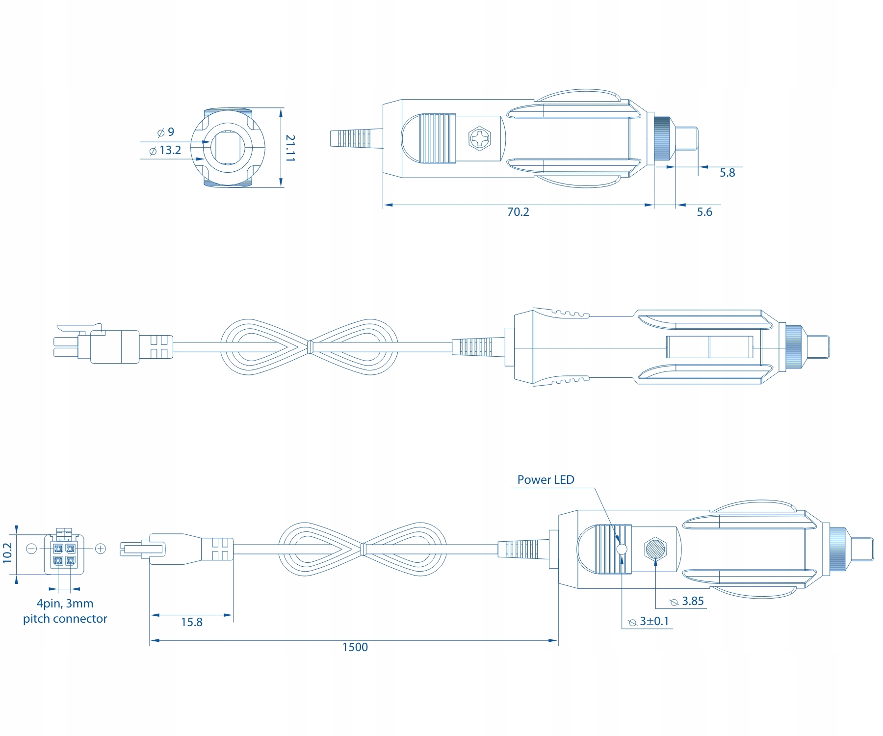 Samochodowy zasilacz Teltonika PR2AM20M umożliwia zasilanie urządzeń z gniazda 12/24 V w pojeździe w zakresie 9-30 V DC. Wyjściowe złącze 4-pin 3 mm i maksymalny prąd 2 A zapewniają stabilne zasilanie, a bezpiecznik oraz dioda LED sygnalizują stan pracy.