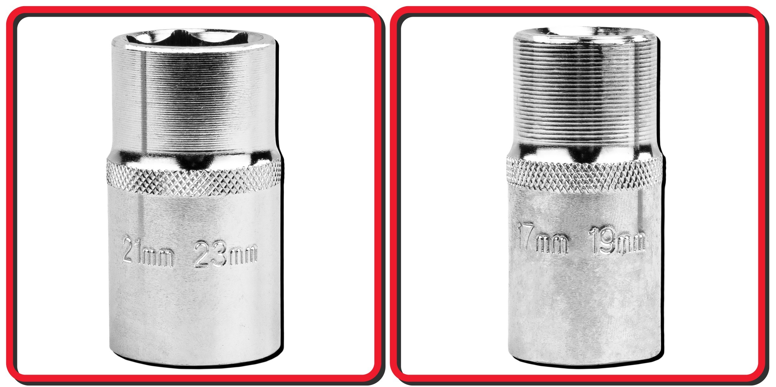 W komplecie otrzymujesz podnośnik, ramię z grzechotką, dwie nasadki 21/23 i 17/19 mm, gumową nakładkę, torbę oraz instrukcję obsługi.