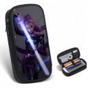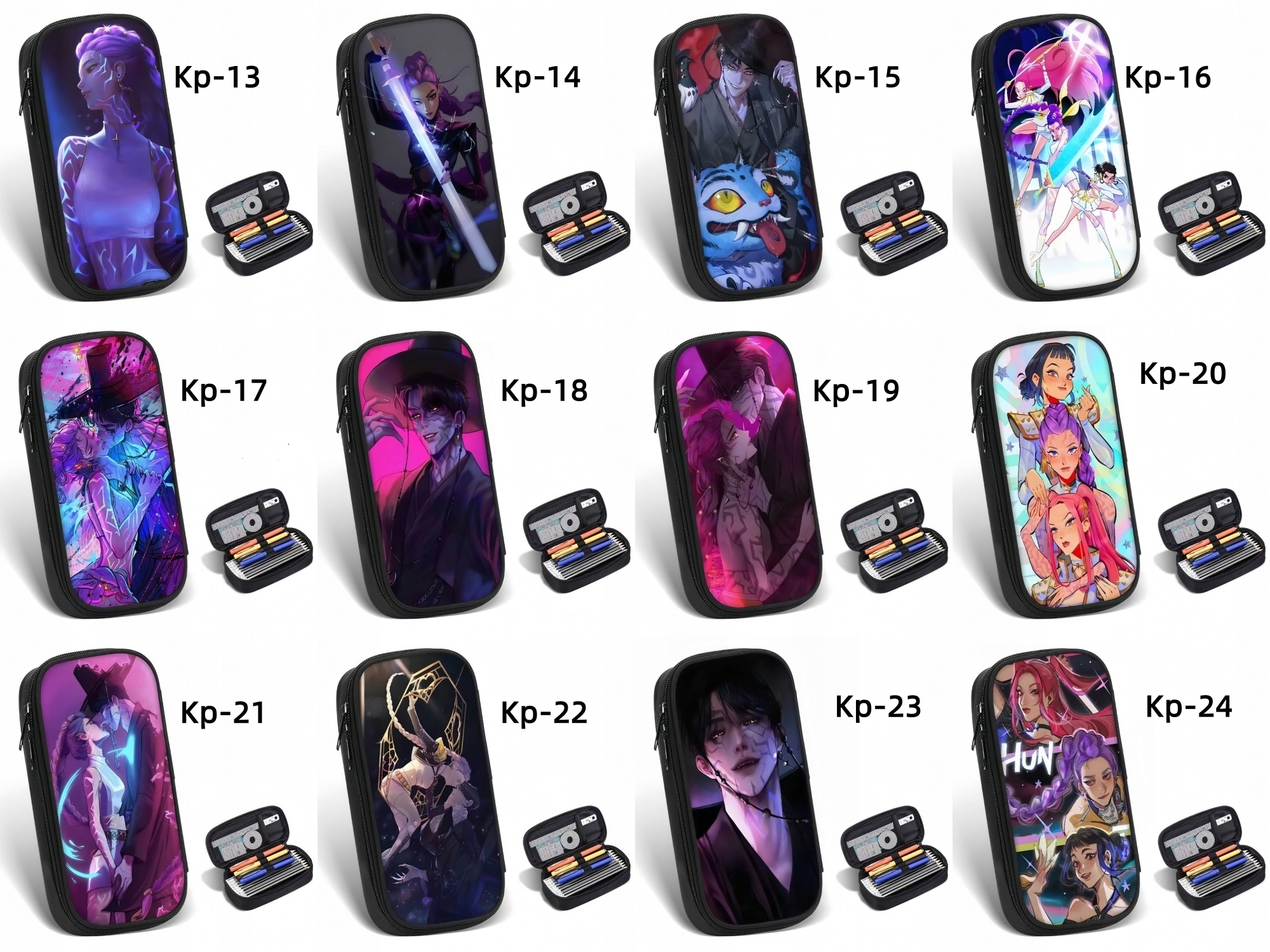 Piórnik KPop Demon Hunters, jako główny kolor, z postaciami z kreskówek, w tym Rumi Mira i Zoey i innymi nadrukowanymi z przodu. Wzory są kolorowe, a projekty postaci żywe. Na froncie znajdują się wzory postaci, a przestrzeń wewnętrzna jest wystarczająco duża, aby pomieścić różne artykuły piśmiennicze i sprzęt.
