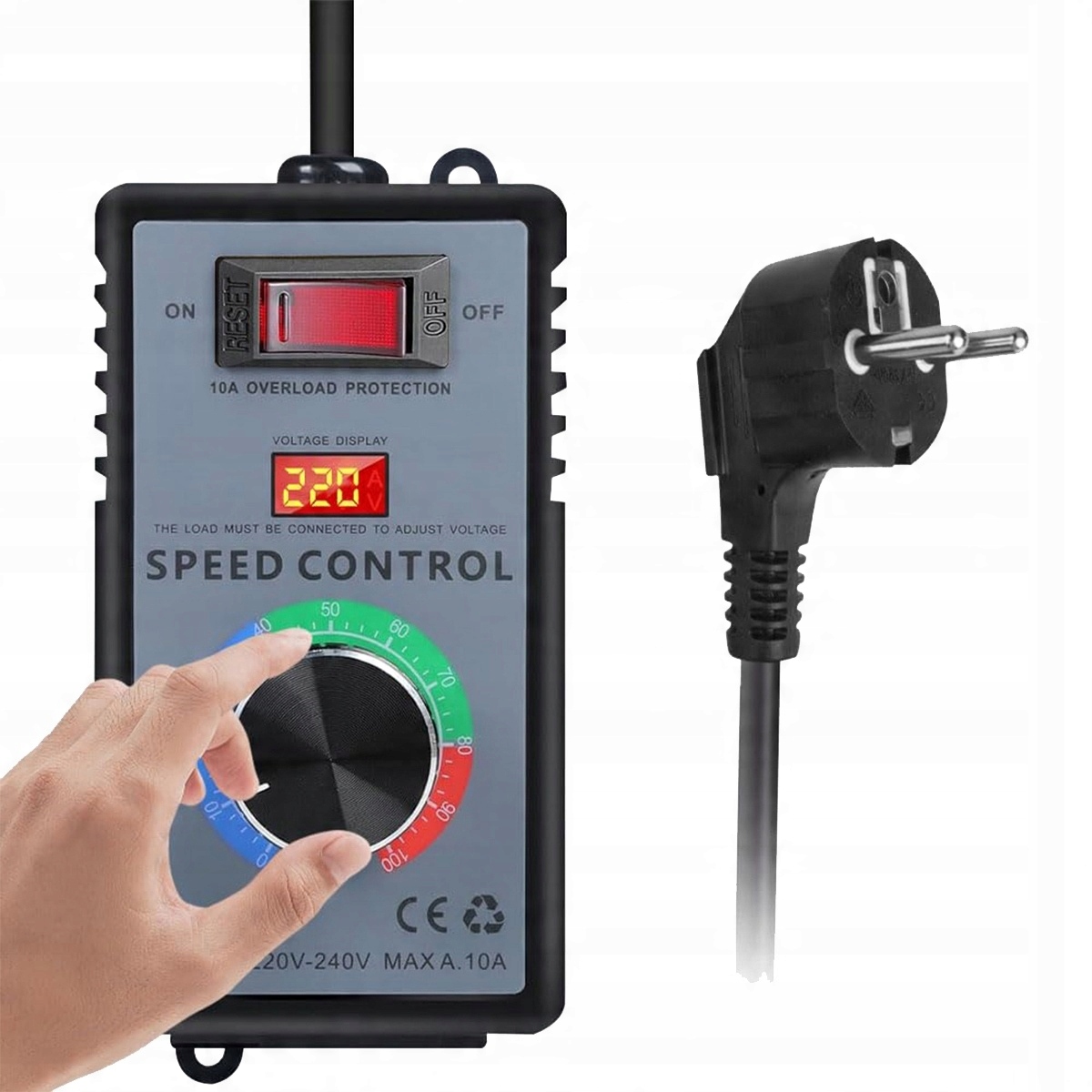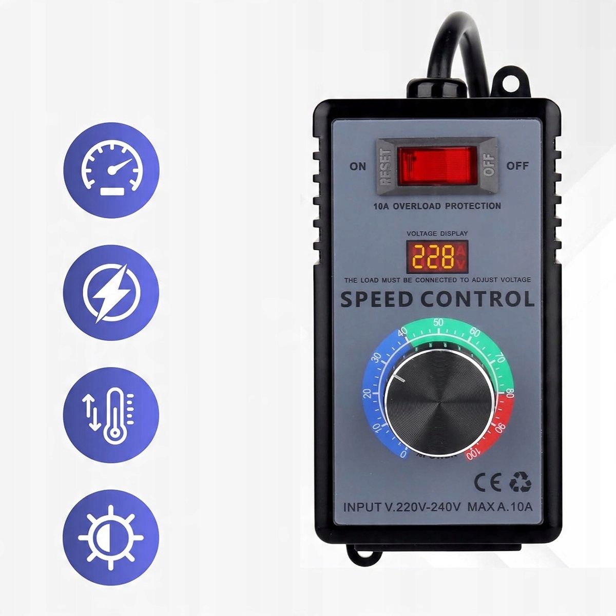 Regulator prędkości ma moc szczytową 4000 W. Maksymalne podłączone obciążenie rezystancyjne nie może przekraczać 2000 W, maksymalna moc obciążenia indukcyjnego nie może przekraczać 500 W, a maksymalna moc obciążenia pojemnościowego nie może przekraczać 300 W, w przeciwnym razie produkt może zostać uszkodzony.