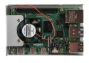 Elegancka obudowa wykonana z aluminium zawiera 3 radiatory i zintegrowany wentylator, dzięki czemu płytka Pi 4 pozostaje chłodna i pracuje z maksymalną wydajnością. W obudowie znajdują się wycięcia na dwa porty micro HDMI, porty audio/wideo, USB i Ethernet, a także porty złącza zasilania USB-C i port dostępu do karty MicroSD.