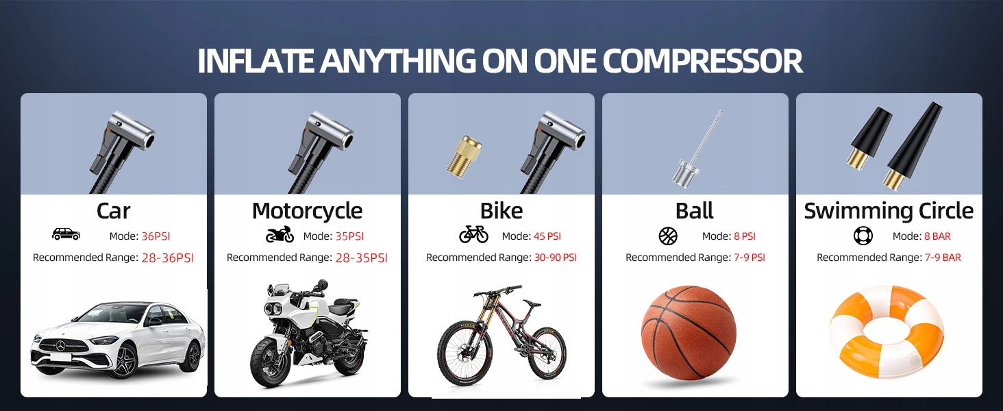 ➤【 5+4+3 BEZPRZEWODOWE SZYBKIE POMPOWANIE 180 PSI】Tylko 3 kroki do zrobienia – inteligentne ustawienia wstępne, szybkie pompowanie i automatyczne wyłączanie. Napędzany przez turbodoładowanie 45 l/min (180 PSI), przenośny rozrusznik samochodowy z kompresorem powietrza pompuje oponę do 30 PSI w zaledwie 2 minuty. 5 trybów pompowania, 4 dysze powietrza, 3 jednostki pompujące i odłączany wąż do pompowania, idealny do samochodów, motocykli, rowerów, piłek itp. Duży, 3,3-calowy ekran, widoczny w słońcu, precyzja ±1 PSI, pamięć ustawień, zabezpieczenie przed przepompowaniem.