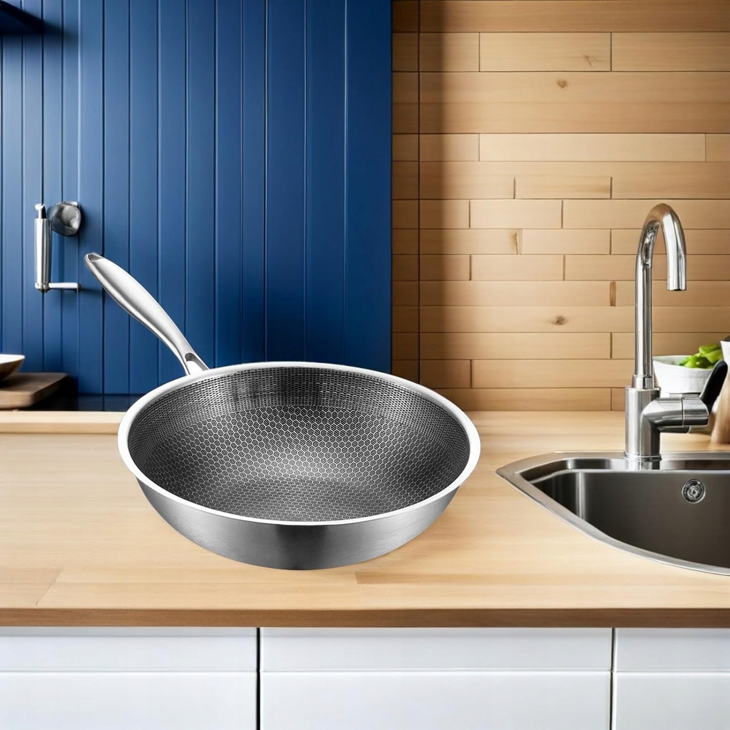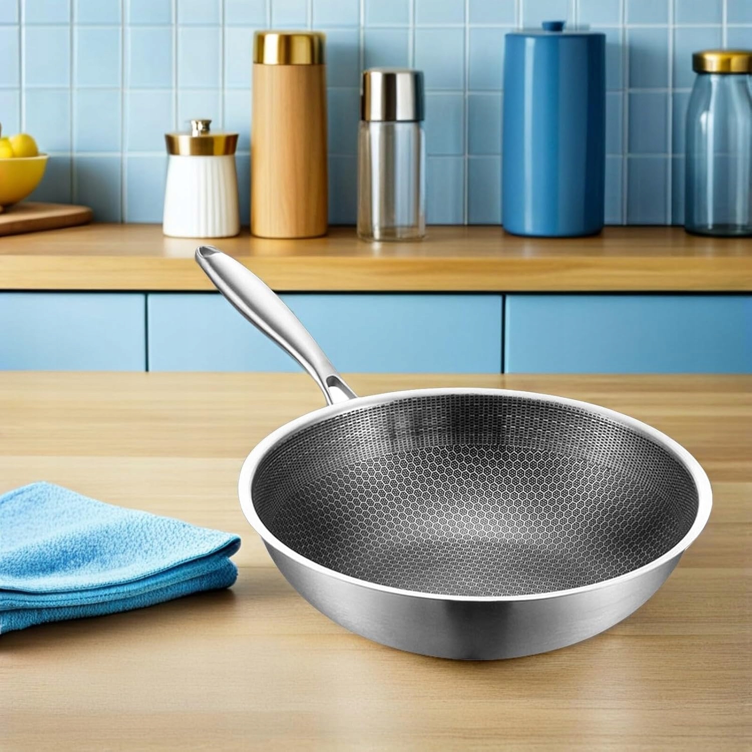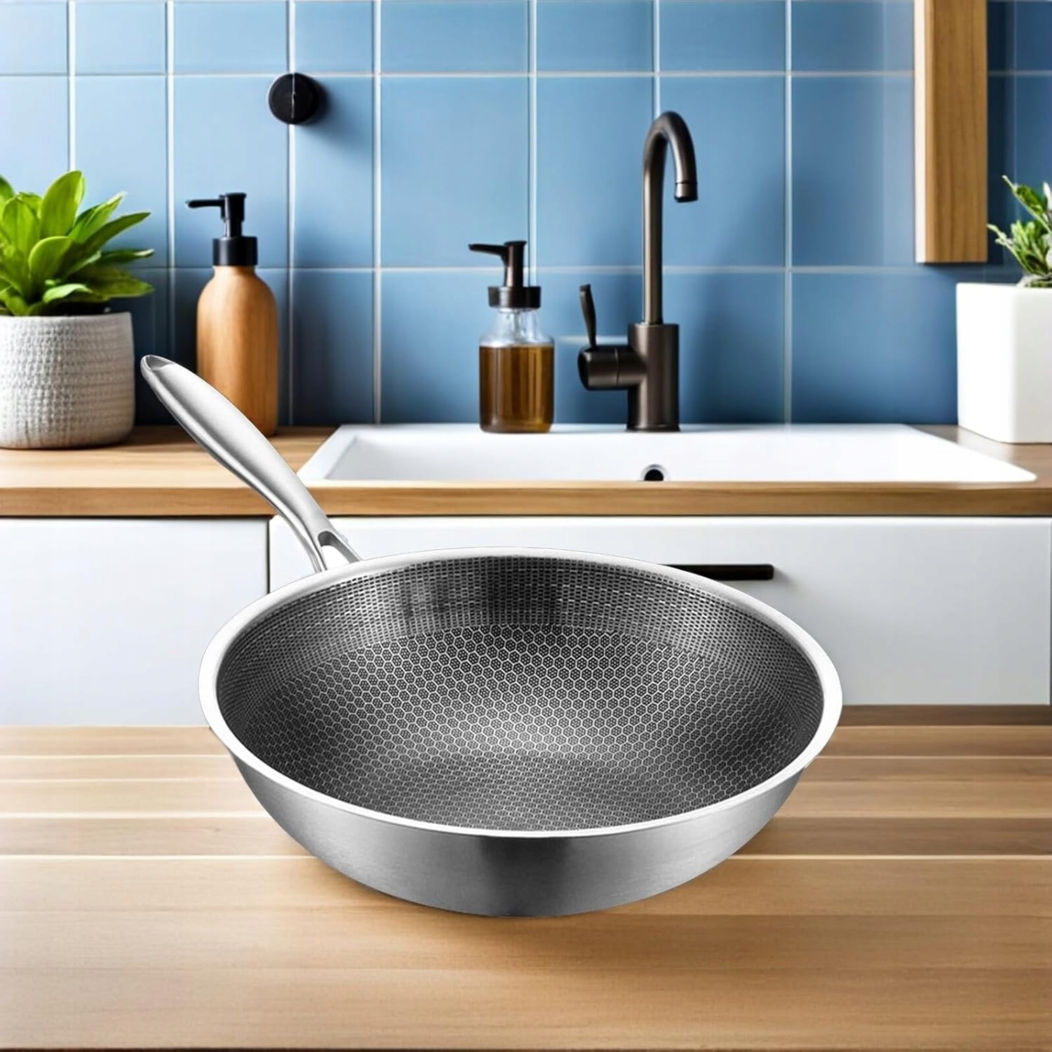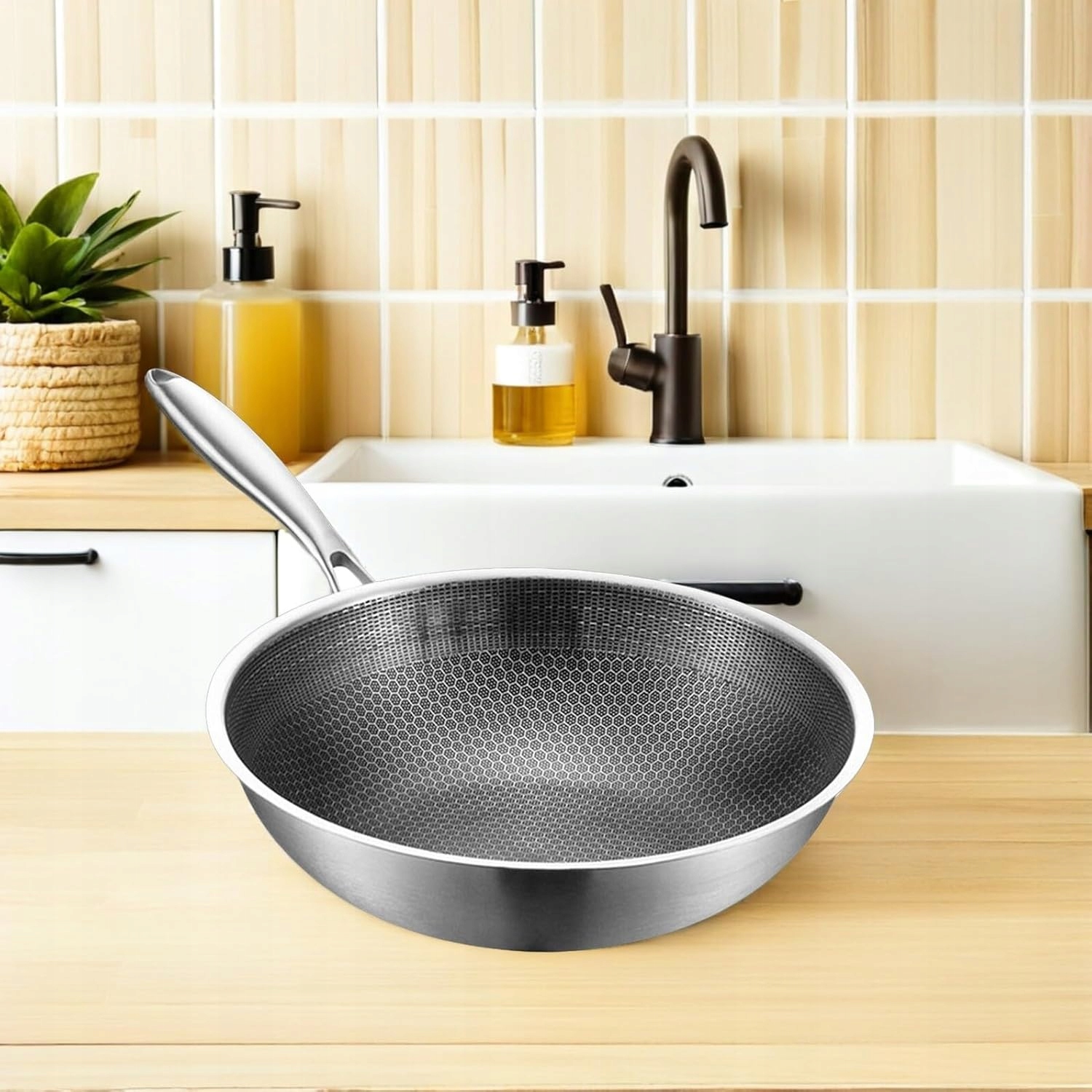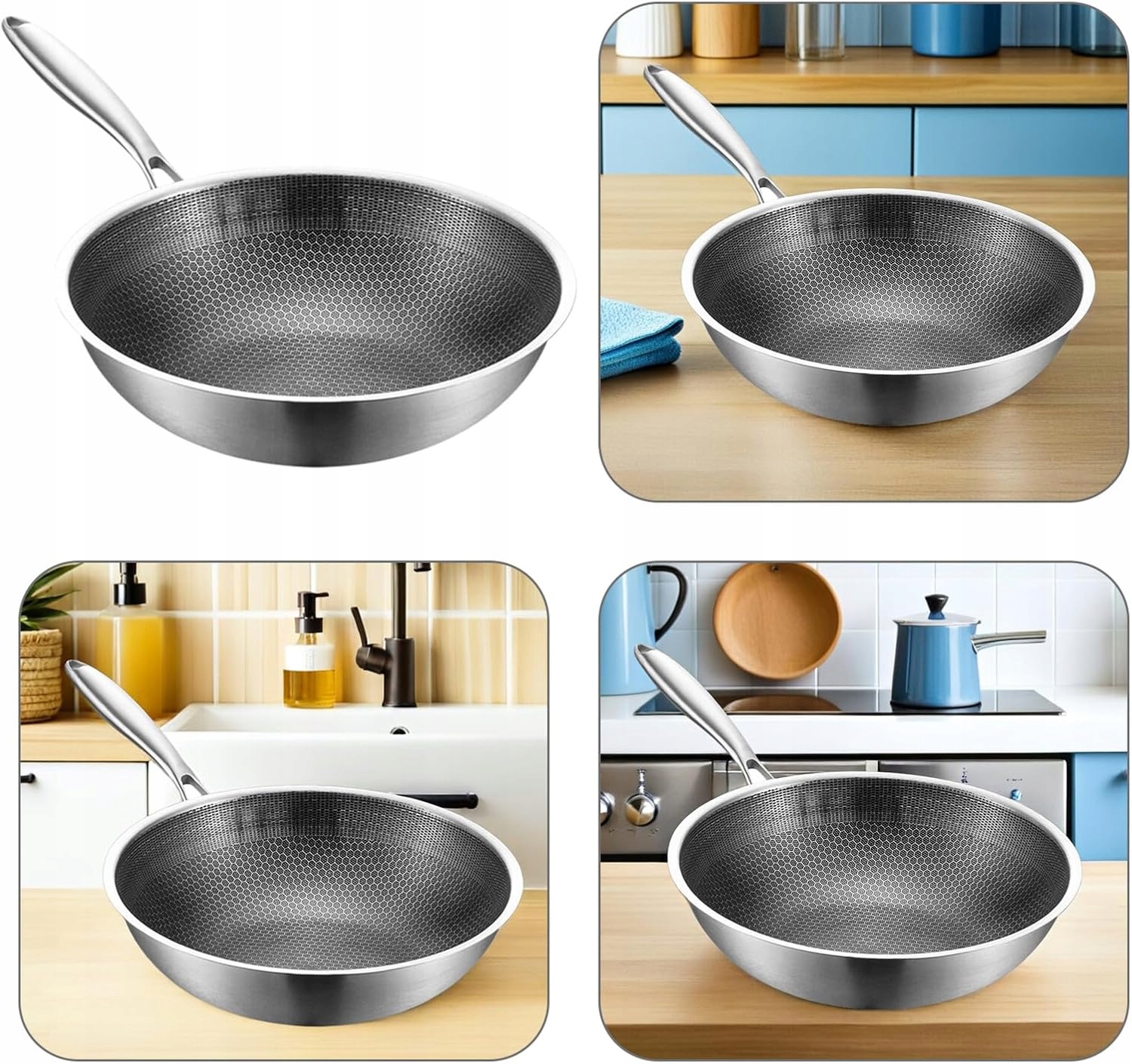Rączka wykonana ze stali nierdzewnej zapewnia pewny chwyt, a duża średnica umożliwia wygodne przygotowywanie większych porcji. To dobry wybór zarówno do szybkiego stir-fry, jak i klasycznego smażenia.