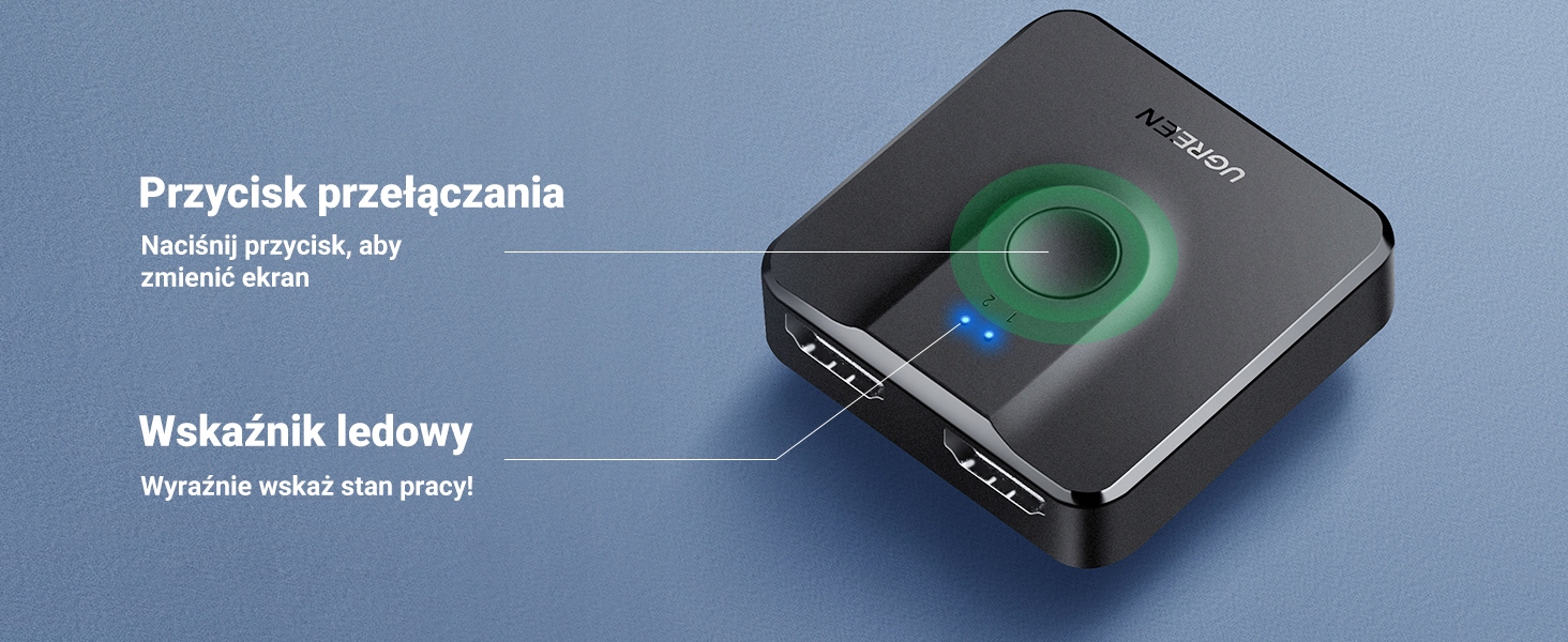 UGREEN dwukierunkowy przełącznik HDMI to praktyczne rozwiązanie do wygodnego podłączania i przełączania urządzeń multimedialnych bez ciągłego przepinania kabli. Obsługuje tryb 2 IN 1 OUT lub 1 IN 2 OUT i zapewnia wysoką jakość obrazu 4K UHD oraz pełne wsparcie dla nowoczesnych formatów audio i wideo.
