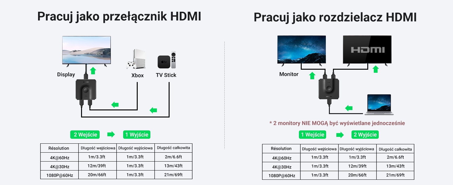 UGREEN 2 w 1 Out Przełącznik HDMI lub 2 w 1 Out HDMI Splitter 4K@30Hz dla PS5, Xbox, TV stick, Switch, PC itp.