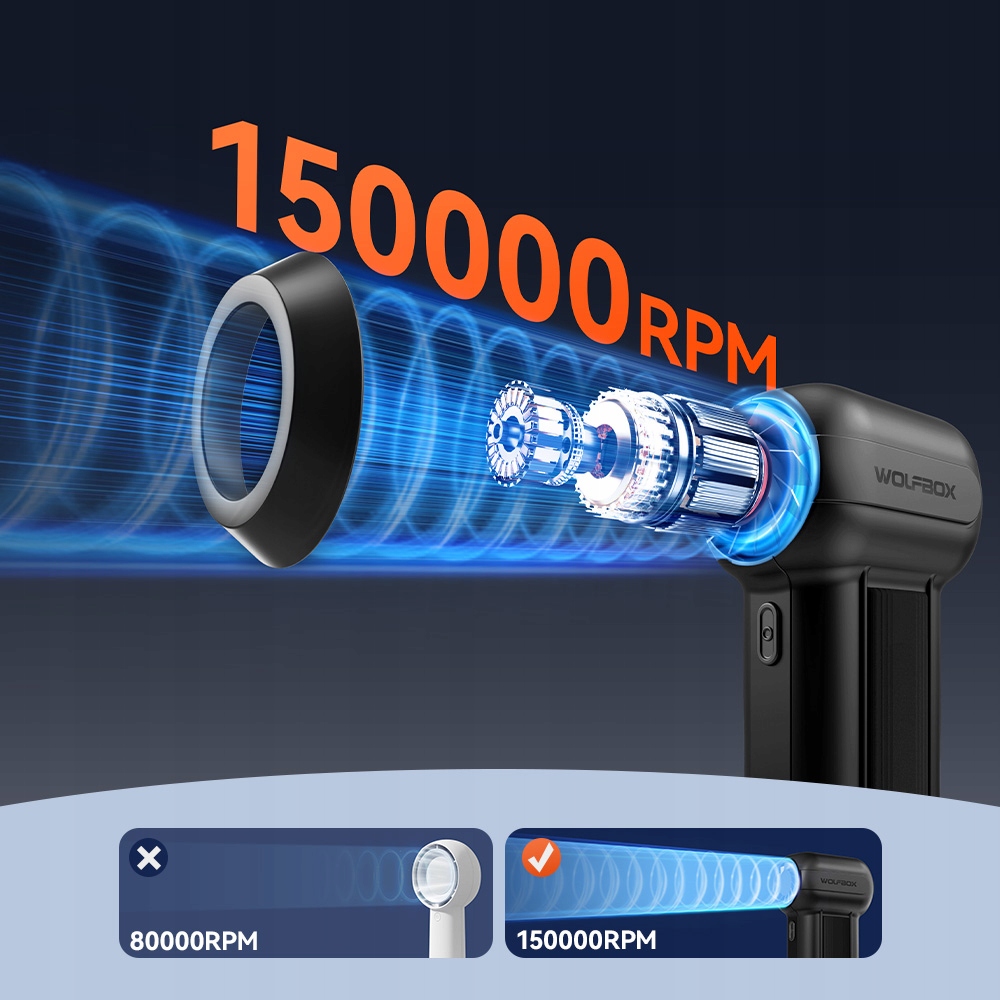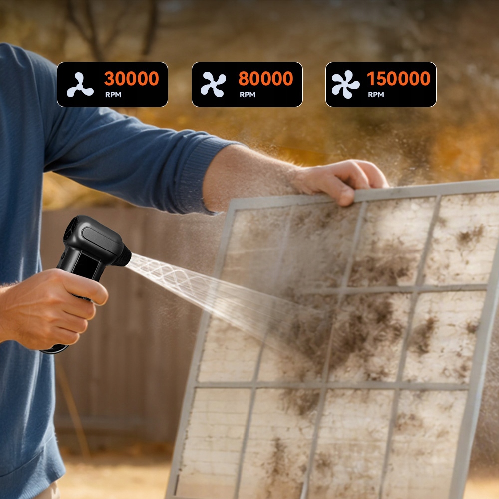 ☑ Szybka moc czyszczenia – silnik Turbo osiąga do 150,000 RPM z przepływem powietrza do 60 m/s, bez wysiłku usuwając kurz, brud i zanieczyszczenia z komputerów, klawiatur, samochodów i trudno dostępnych miejsc.