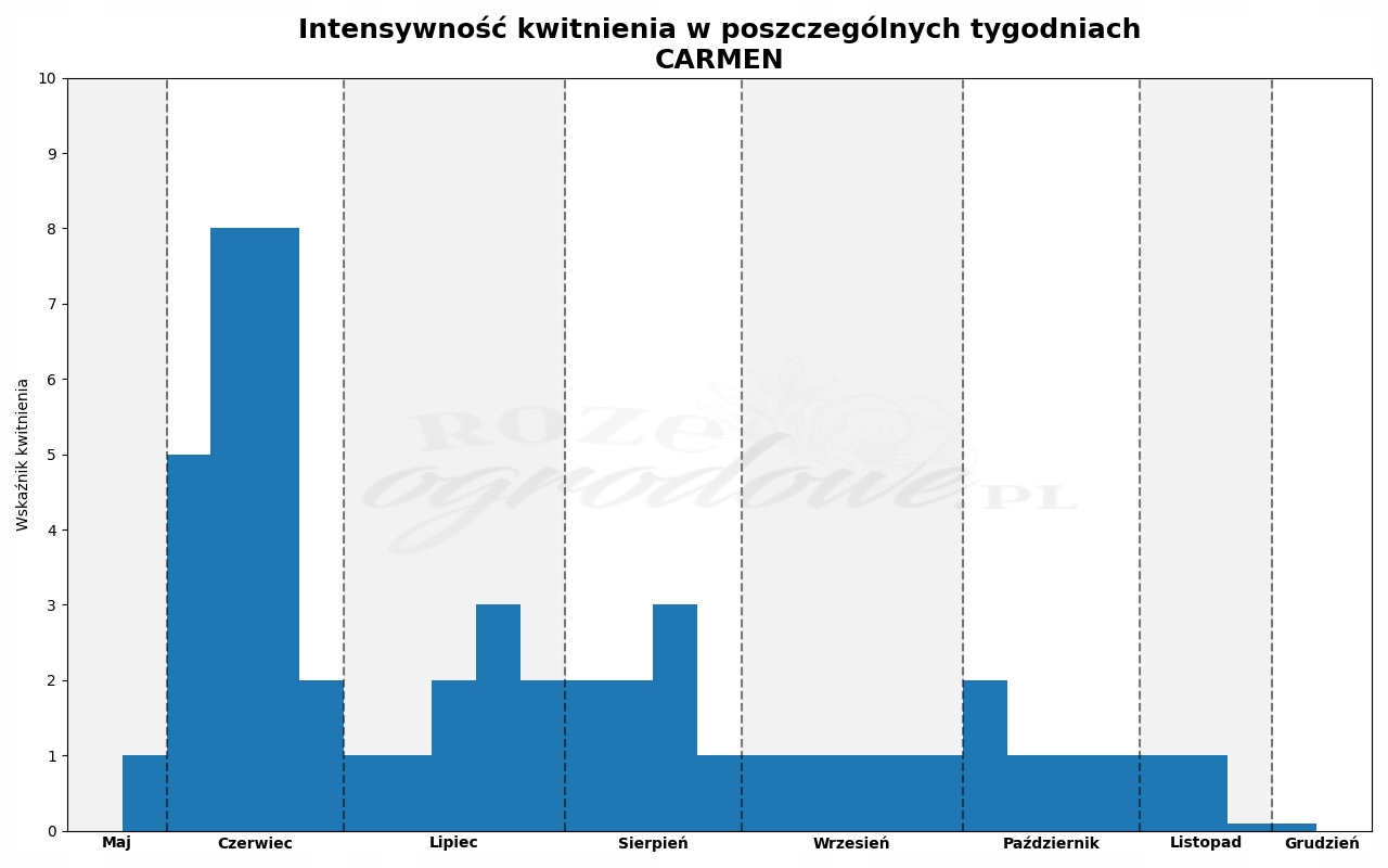 Carmen ma nieduże lecz bardzo pełne i wyraziste kolorystycznie kwiaty o delikatnym zapachu.