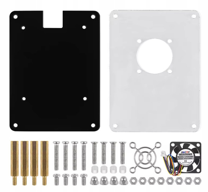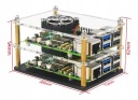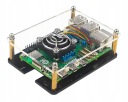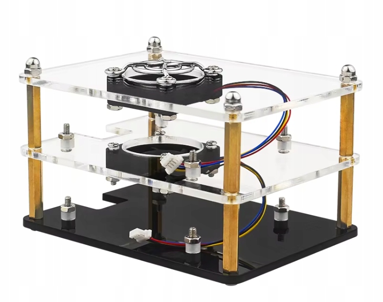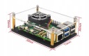 Obudowa wykonana jest z wysokiej jakości przezroczystego akrylu, co nadaje jej estetyczny, "kryształowy" wygląd. W zestawie znajduje się dedykowany wentylator chłodzący (oznaczony jako PWN/PWM), montowany na górnej płycie, który aktywnie wspomaga odprowadzanie ciepła z procesora. Całość wspiera się na solidnych, metalowych dystansach, które zapewniają stabilność konstrukcji nawet przy spiętrzeniu kilku warstw. Dolna płyta montażowa wykonana jest w kolorze czarnym, co stanowi estetyczny kontrast dla transparentnej góry.