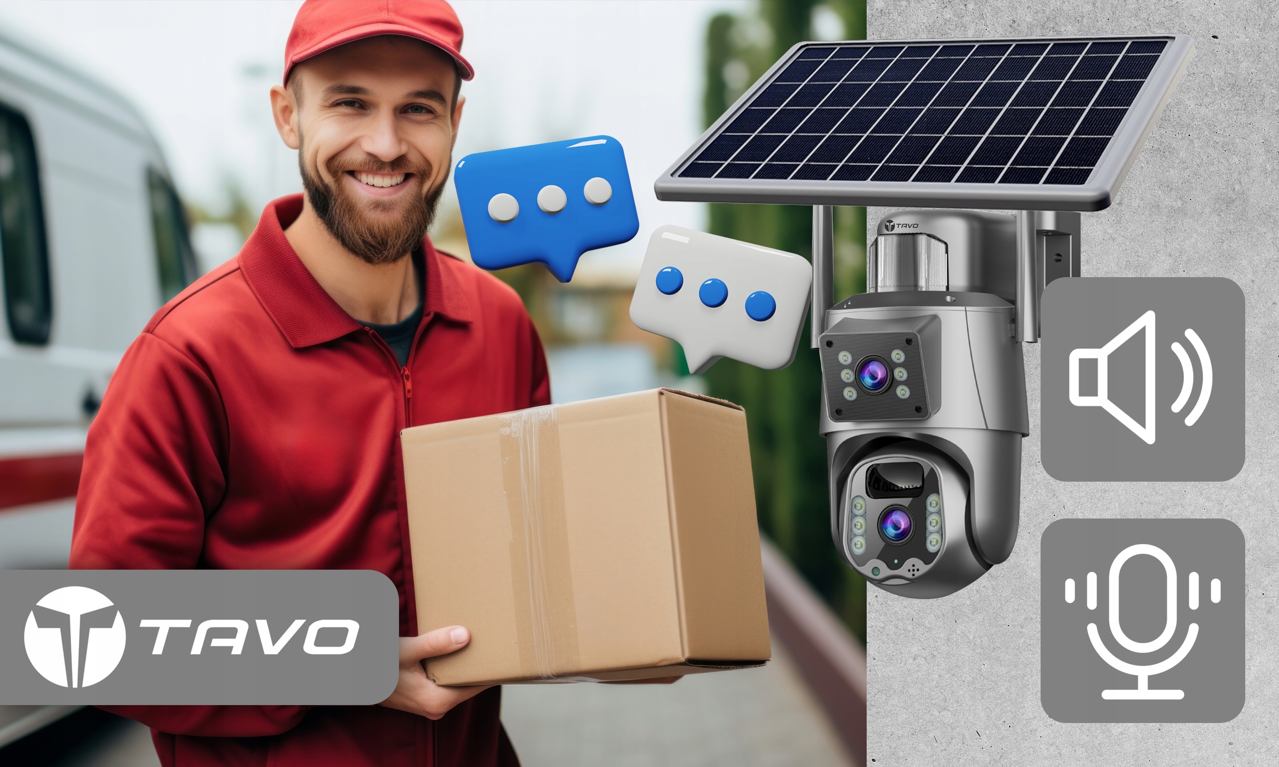 Dzięki wbudowanemu mikrofonowi i głośnikowi możesz komunikować się z gośćmi, kurierem lub odstraszyć intruza — wszystko z poziomu aplikacji TAVO CAM PRO.