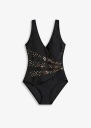 Czarny, jednoczęściowy strój kąpielowy damski marki Bonprix to połączenie elegancji i komfortu, które sprawi, że poczujesz się pewnie na plaży lub w basenie. Delikatny, regularny fason podkreśla naturalne kształty, jednocześnie zapewniając swobodę ruchów. Główny element konstrukcji to półusztywniany biustonosz, który nie tylko stabilizuje, ale także wyrównuje sylwetkę, nadając ją pełniejszy, zrównoważony wygląd.