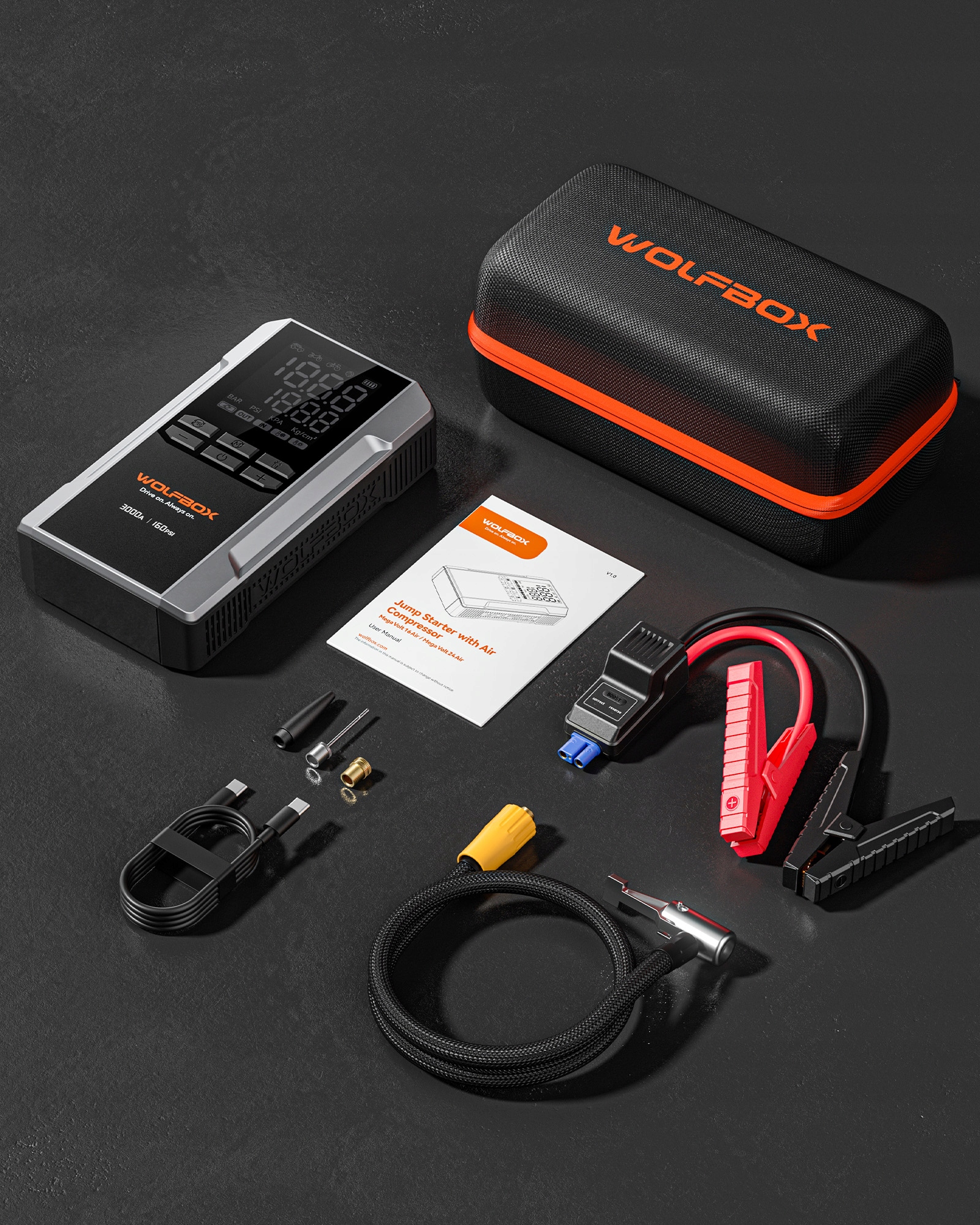☑ All-in-One Jump Starter & Air Compressor – prąd szczytowy 3000A z łatwością uruchamia martwe pojazdy 12 V do silników gazowych 8.0 l lub wysokoprężnych 6.0 l. Wbudowana sprężarka powietrza obsługuje samochody, SUV-y i pickupy w jednym kompaktowym urządzeniu.