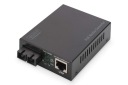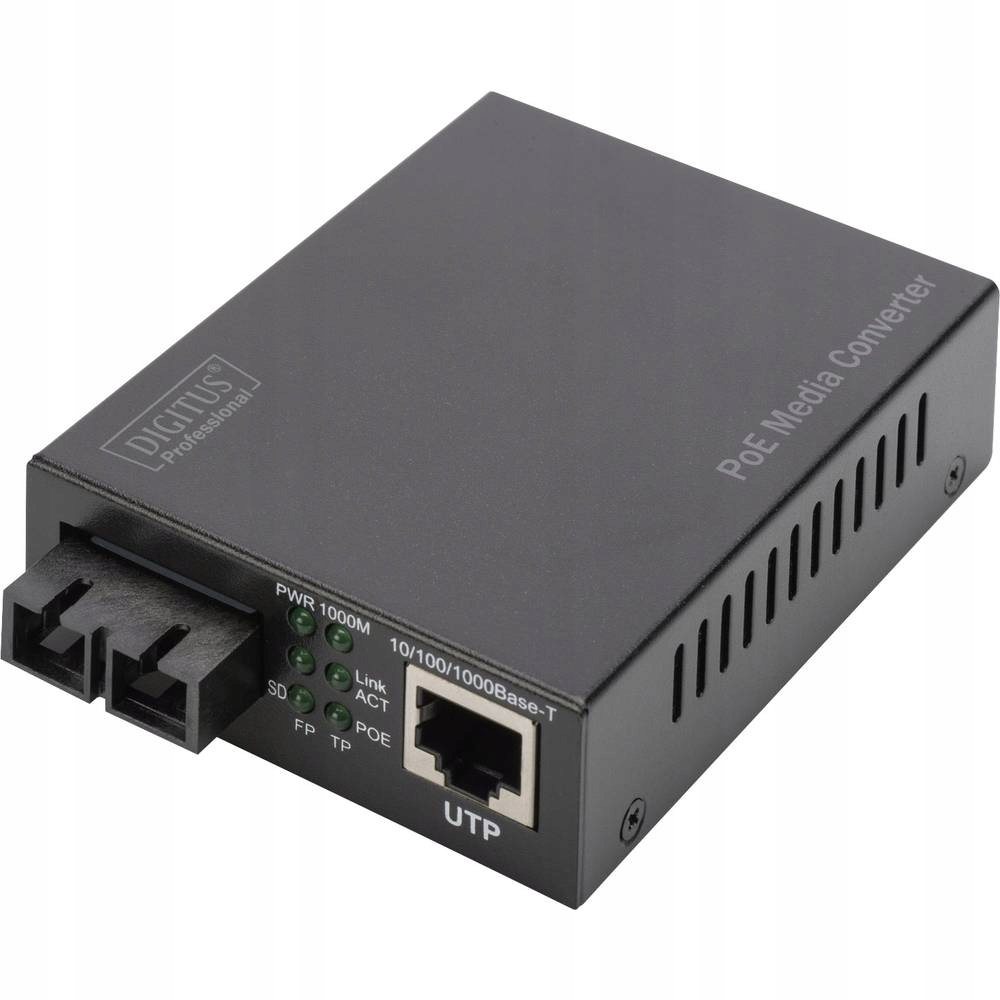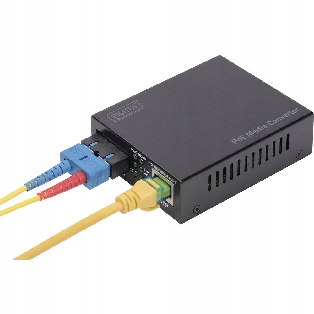 DIGITUS Media Converter model DN-82150 to profesjonalny konwerter światłowodowy przeznaczony do realizacji połączeń w sieciach Gigabit Ethernet. Umożliwia konwersję sygnału pomiędzy kablem miedzianym (RJ45) a światłowodowym (SC MM), zapewniając szybki transfer danych do 1000 Mb/s oraz zasięg do 0,5 km przy długości fali 850 nm. Urządzenie wyposażone jest we wtryskiwacz PoE (PSE), umożliwiający zasilanie urządzeń sieciowych kompatybilnych z technologią Power over Ethernet. Solidna, kompaktowa obudowa w kolorze czarnym gwarantuje niezawodność i długie użytkowanie w profesjonalnych instalacjach sieciowych.