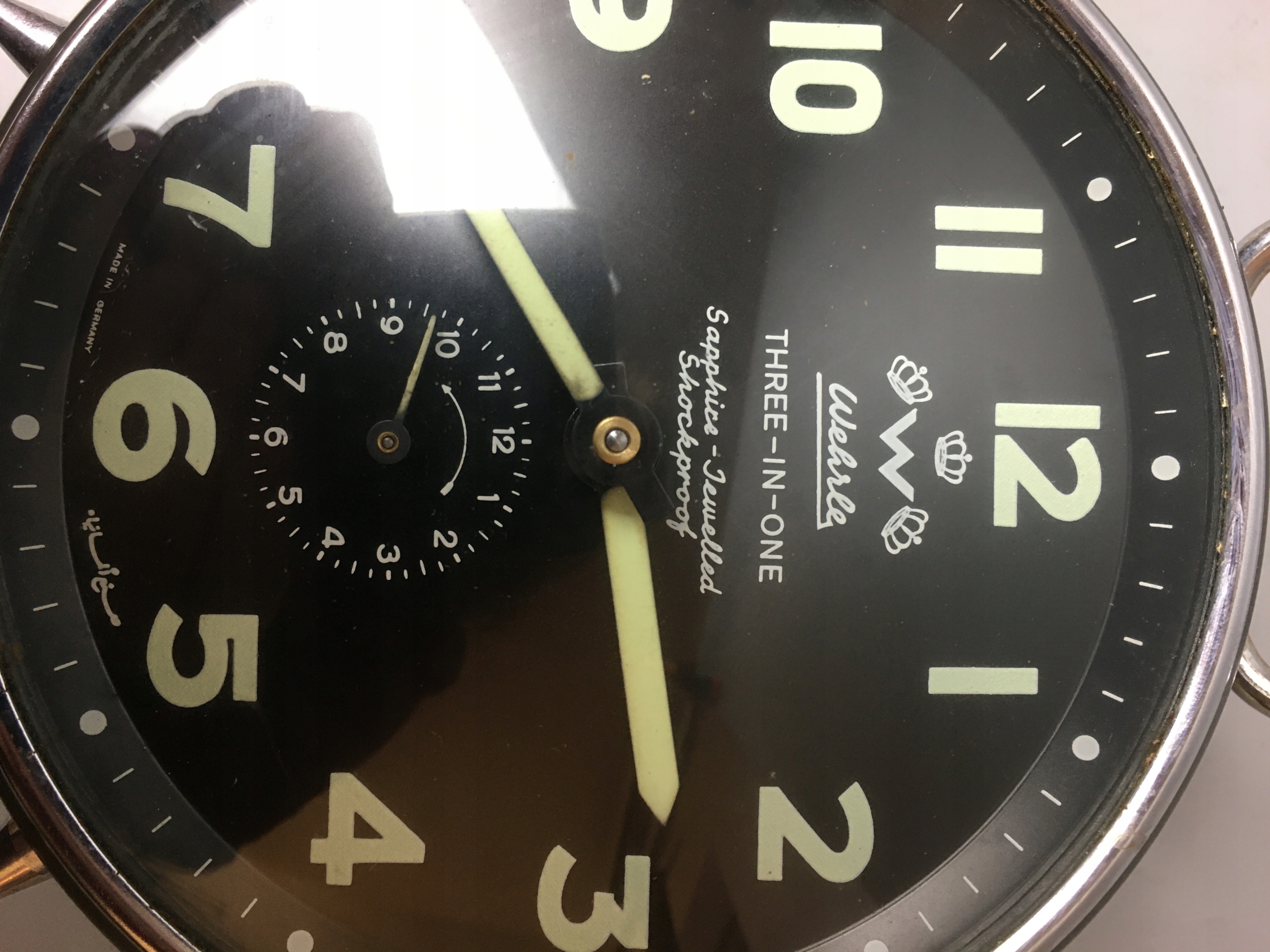 Zegar marki Wehrle z funkcją Three in One pochodzący z połowy XX-ego wieku.