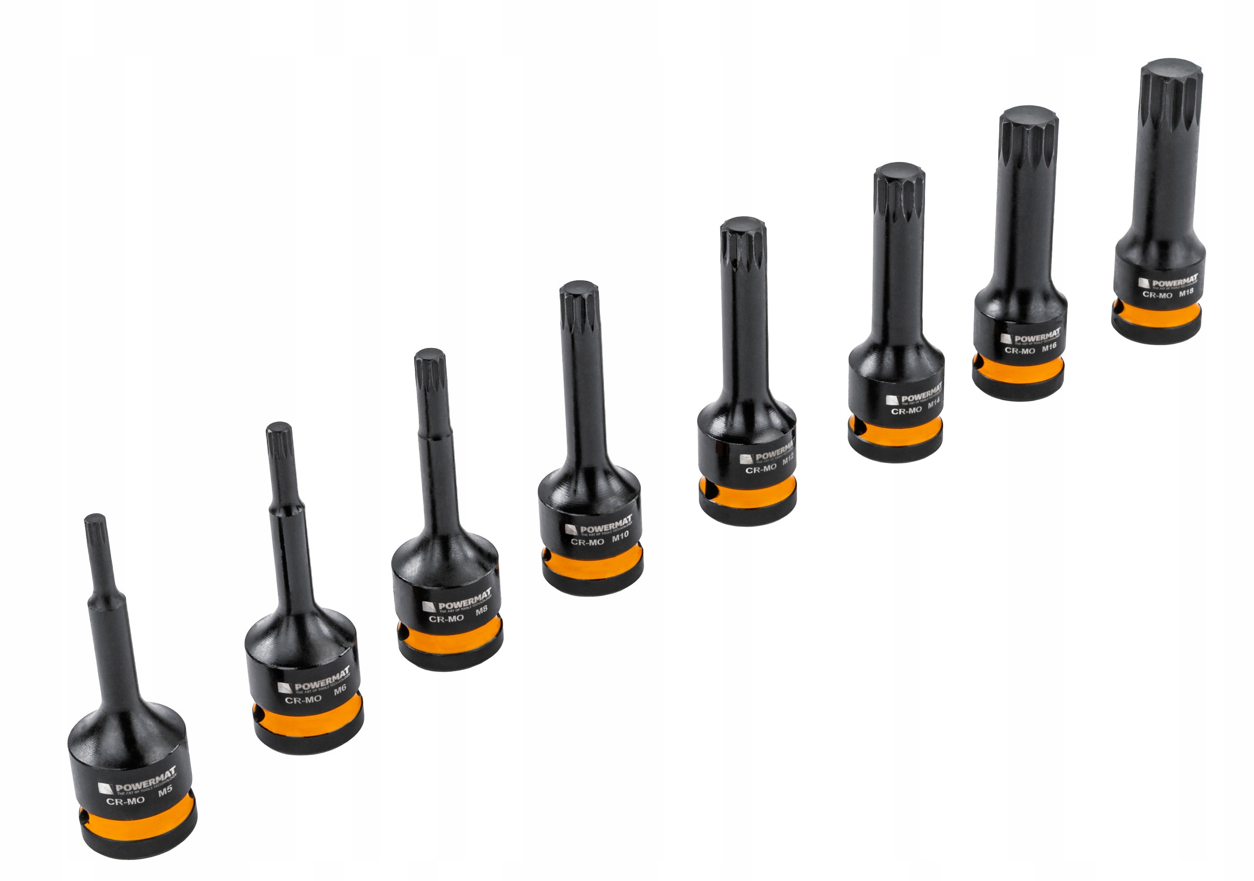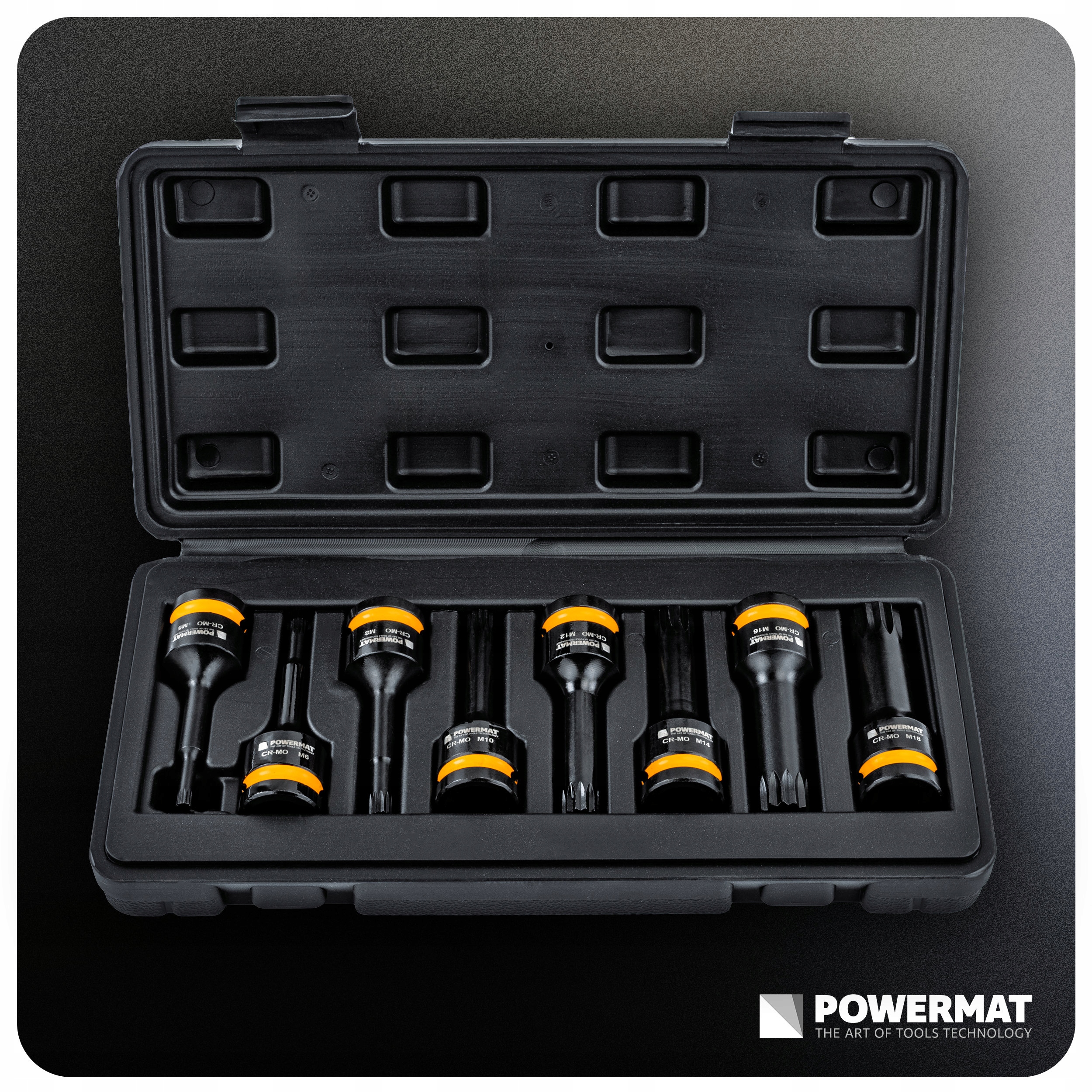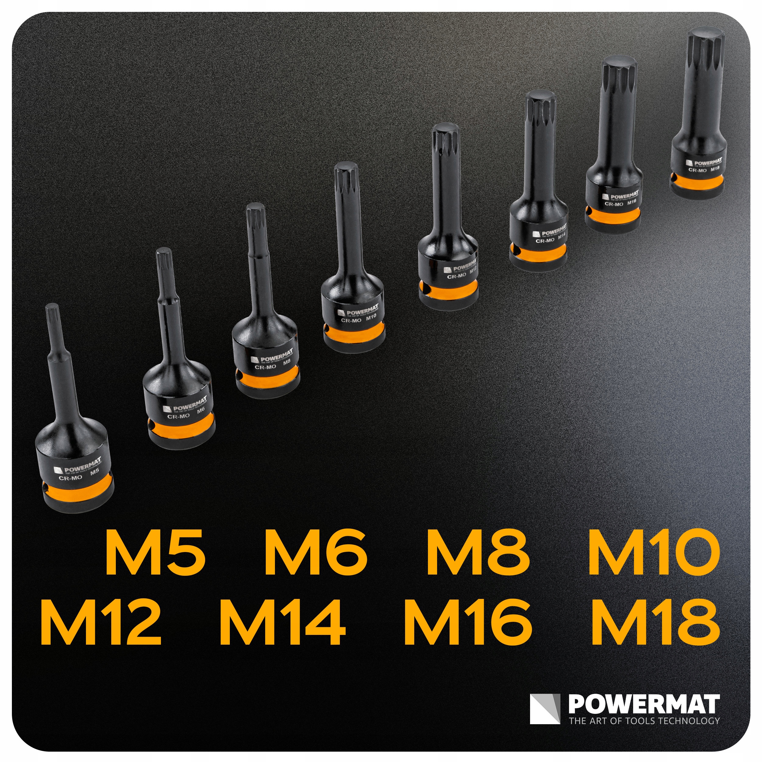 Zestaw zawiera 8 nasadek w rozmiarach od M5 do M18.