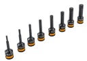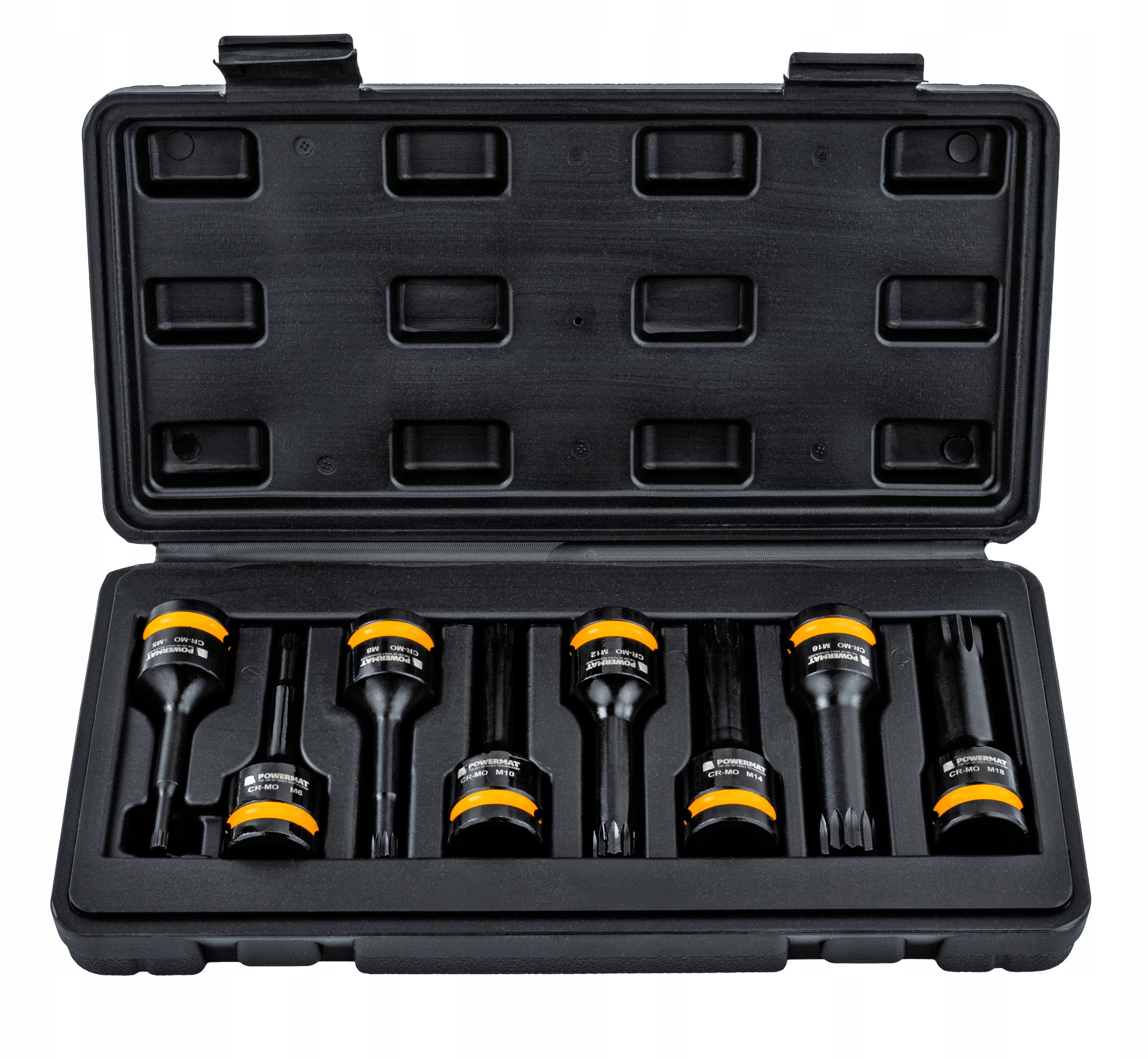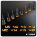 W zestawie znajduje się 8 nasadek: M5, M6, M8, M10, M12, M14, M16, M18.