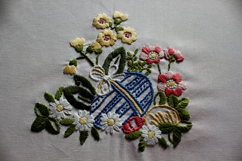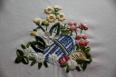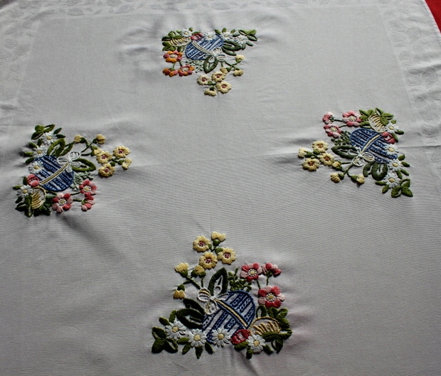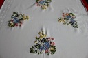 Oryginalny obrus w stylu retro z bardzo dobrej białej bawełny/łatwe prasowanie/ozdobiony ręcznym haftem płaskim. Precyzyjnie wykonany haft przedstawia bukiet kolorowych wiosennych kwiatków/stokrotki, pierwiosnki, wśród których ukryta jest śliczna pisanka .Piękny haft w temacie wiosny.