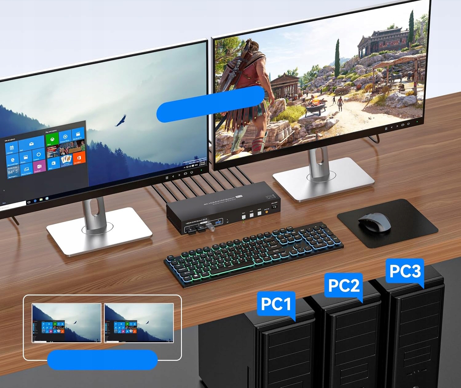 Przełącznik KVM 3 PC 2 monitory HDMI 4K USB 3.0 z pilotem IR to niezwykle funkcjonalne urządzenie, które pozwala na zarządzanie trzema komputerami jednocześnie, przy jednoczesnym podłączeniu dwóch monitorów. Dzięki temu, użytkownicy mogą łatwo przełączać się między różnymi komputerami, co znacznie zwiększa wydajność pracy, zarówno w zastosowaniach biurowych, jak i w domowych. Przełącznik jest idealnym rozwiązaniem dla osób, które dysponują różnymi systemami operacyjnymi i potrzebują elastyczności podczas pracy z różnorodnymi urządzeniami. Nie ma potrzeby ciągłego przełączania kabli, co ułatwia organizację miejsca pracy oraz pozwala na utrzymanie porządku na biurku.