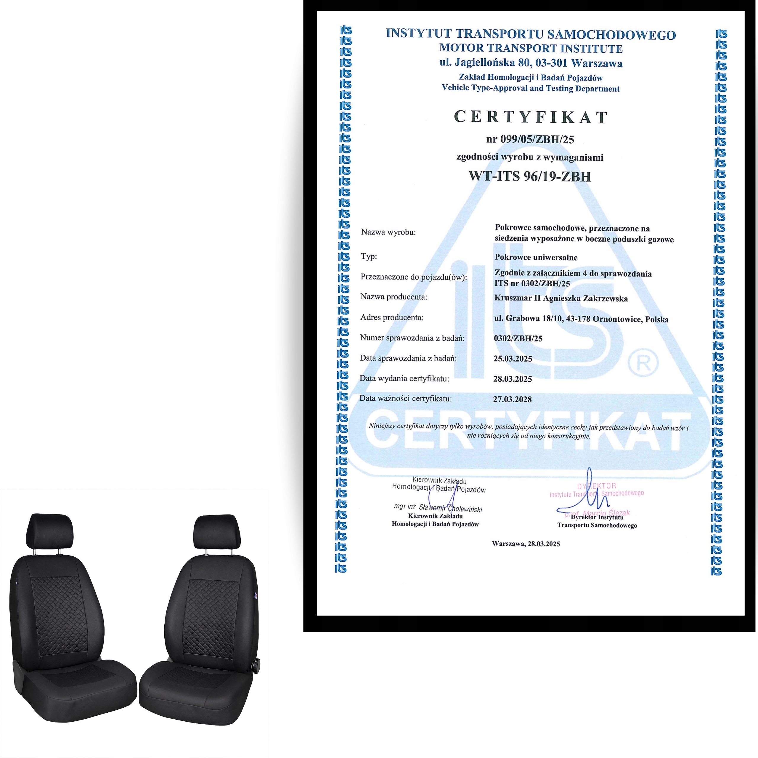 Pokrowce posiadają atest Instytutu Transportu Samochodowego, co potwierdza pełną kompatybilność z bocznymi poduszkami powietrznymi. Specjalne szwy umożliwiają ich prawidłowe działanie, zachowując pełne bezpieczeństwo kierowcy i pasażera.