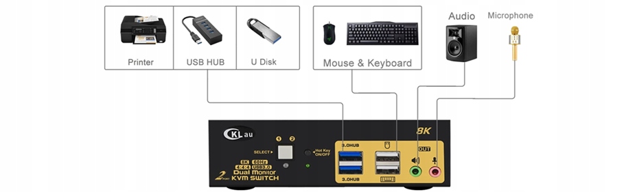 2 komputery współdzielą jeden zestaw: klawiaturę, mysz, jeden monitor, audio, mikrofon oraz urządzenia peryferyjne USB 3.0. Obsługa standardów DisplayPort 1.4, HDMI 2.1, HDCP oraz HDR10.