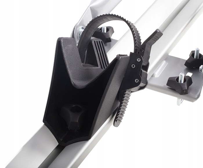 Montaż uchwytu na belkach bagażnika bazowego jest prosty i intuicyjny. W zestawie znajdują się wszelkie niezbędne elementy montażowe: