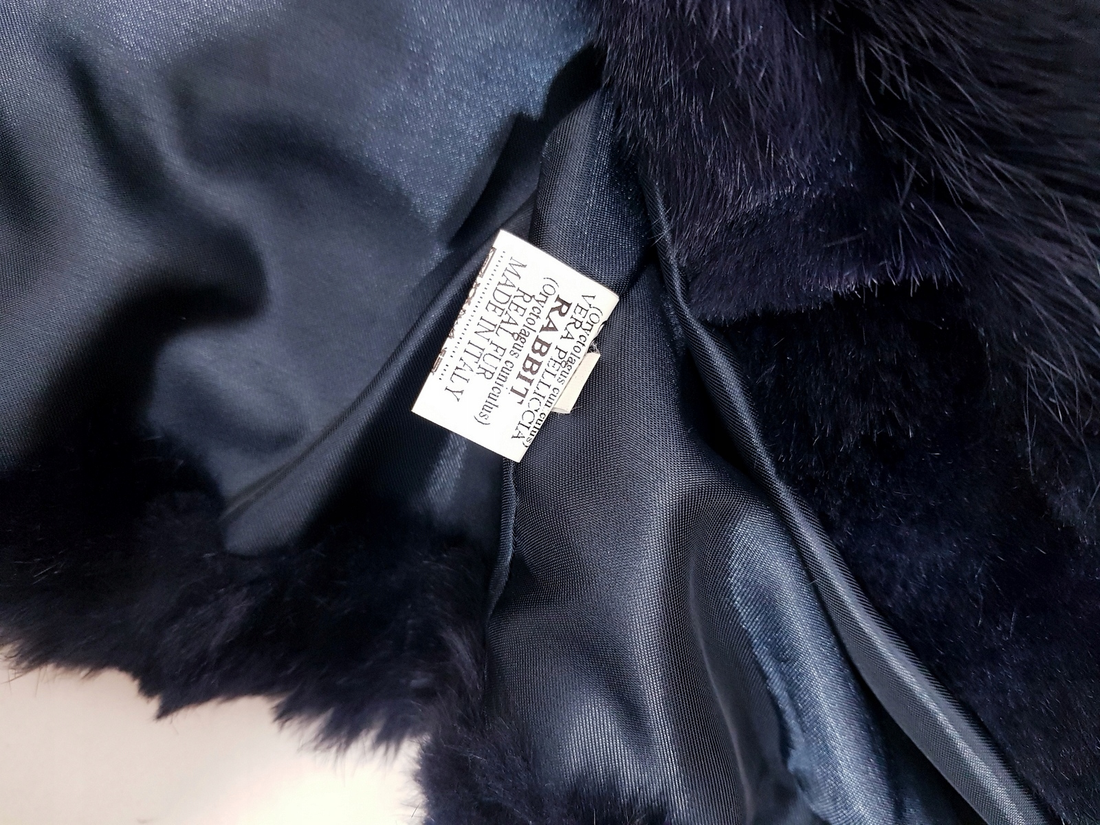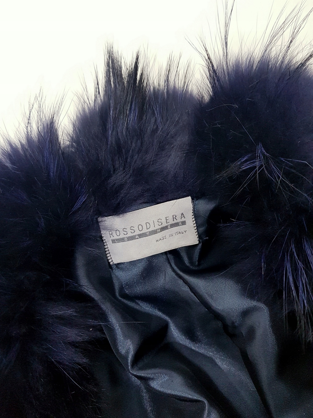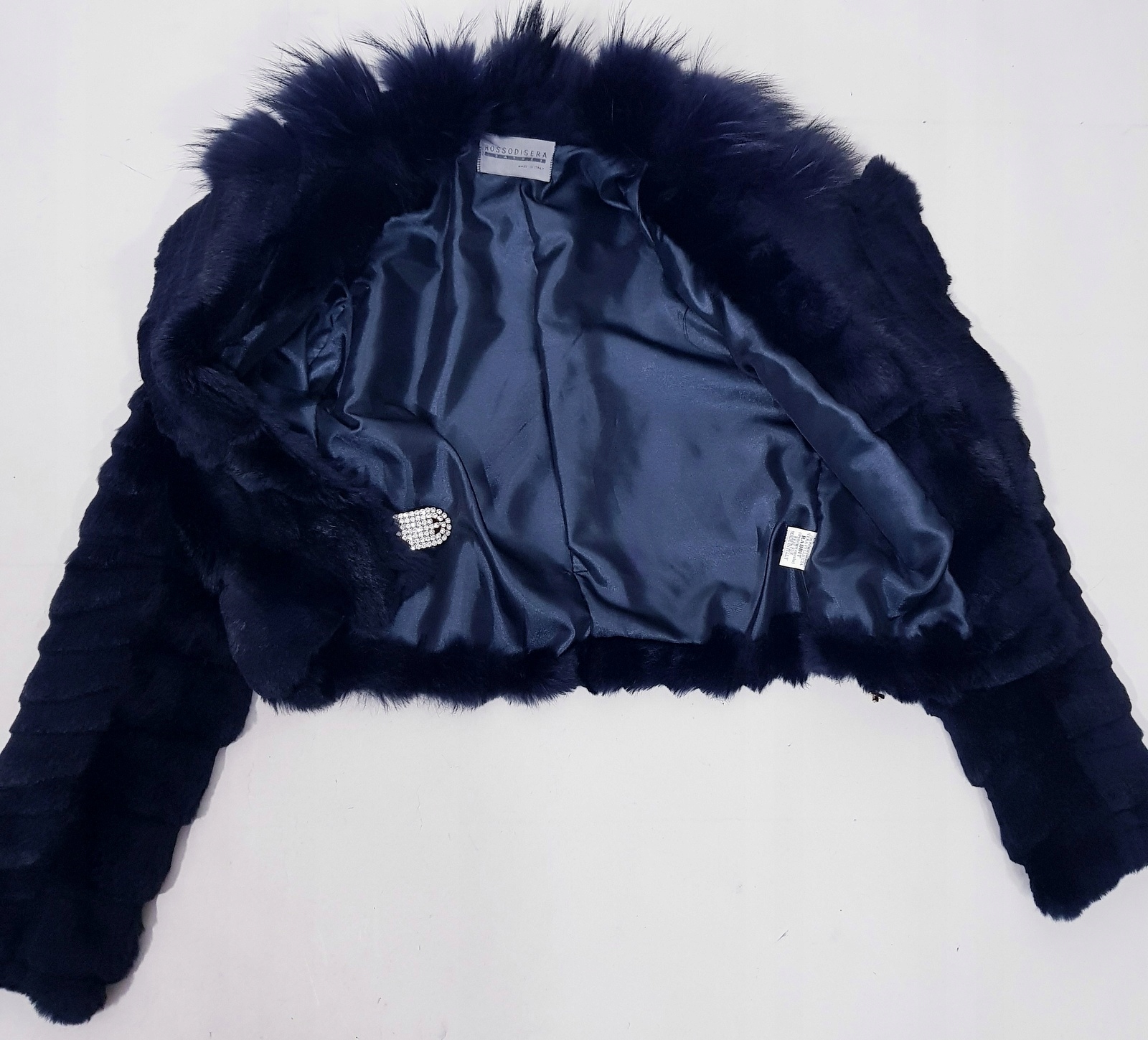 Oferuję do sprzedania naturalne futro z królika epilowanego renomowanej włoskiej marki ROSSODISERA,przy szyi kołnierz z jenota ,zapinane na kuśnierskie keski oraz z boku dodatkowo ozdobna firmowa złota klamra wysadzana kryształkami,futro bardzo lekkie,wewnątrz atłasowa podszewka,w ramionach wszyte poduszki ,fason krótki do pasa ,kolor kruczoczarny w realu bardziej wpadający w czarny w świetle DARK NAVY .