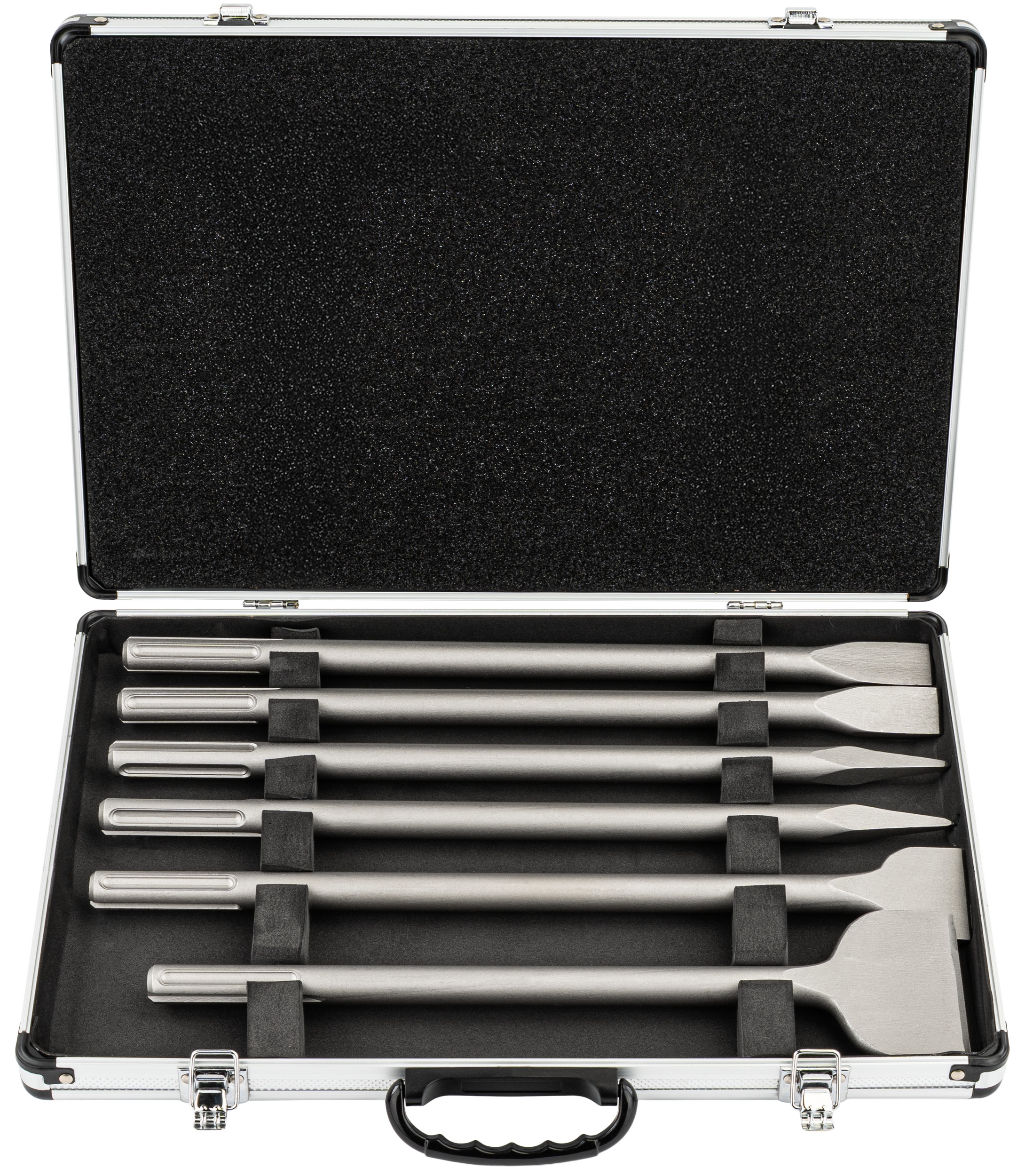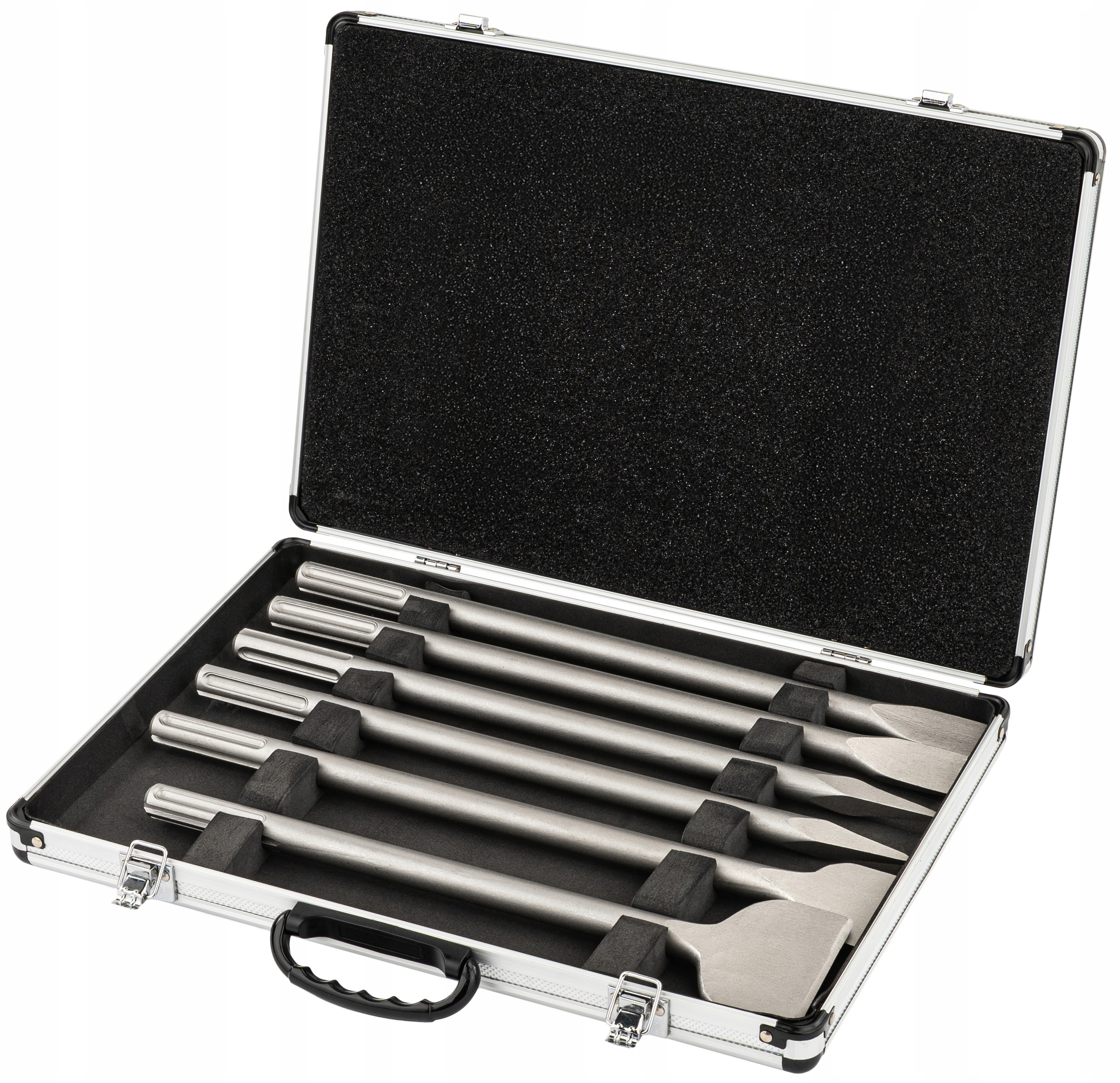 Zestaw obejmuje dłuta płaskie 25x400 mm (2 szt.), 50x400 mm, 80x360 mm oraz szpicaki 18x400 mm (2 szt.). Łącznie otrzymujesz 6 elementów.