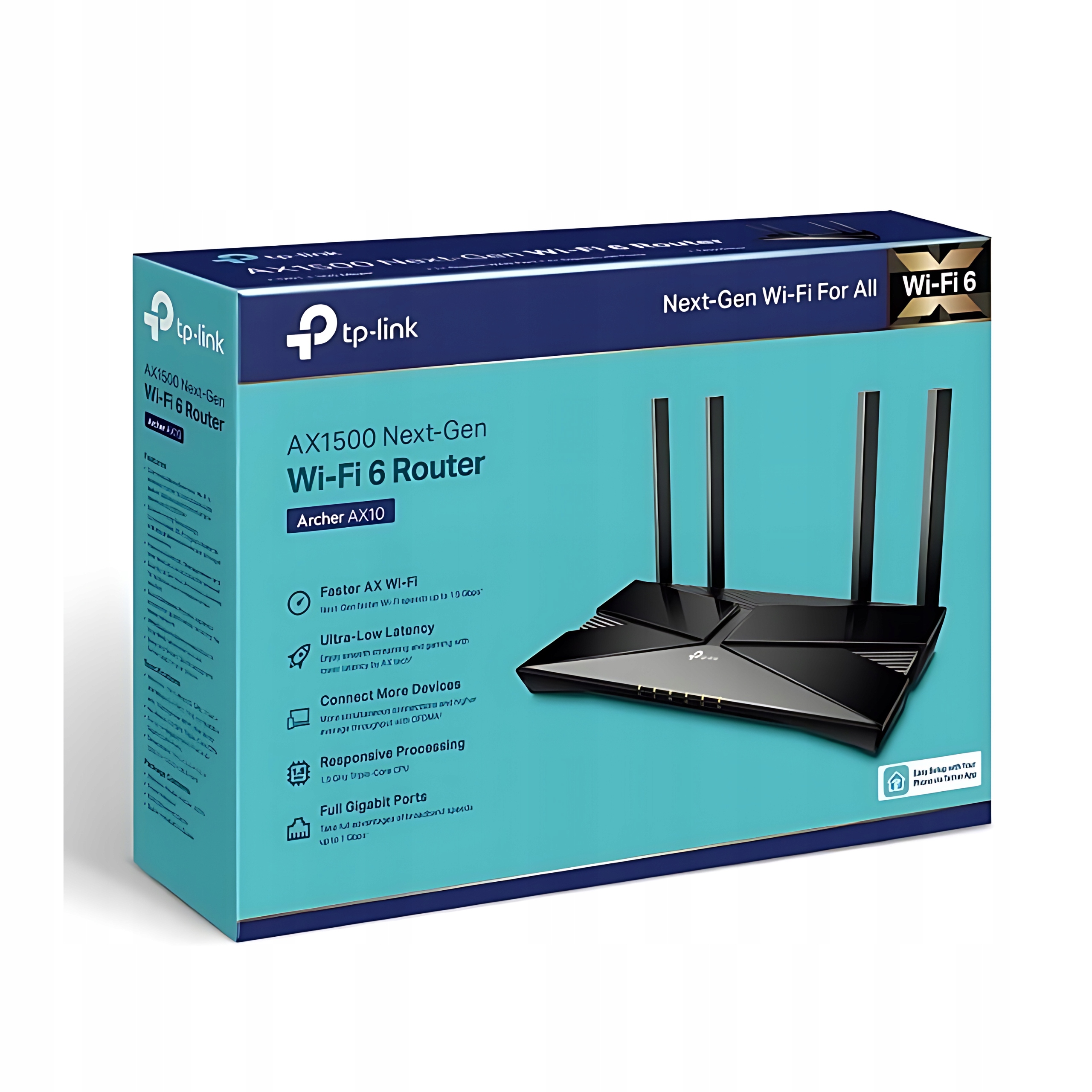 TP-Link Archer AX10 to zaawansowany router, który wykorzystuje technologię Wi-Fi 6, zapewniającą wyższe prędkości, lepszą wydajność i minimalizację zakłóceń w transmisji danych.