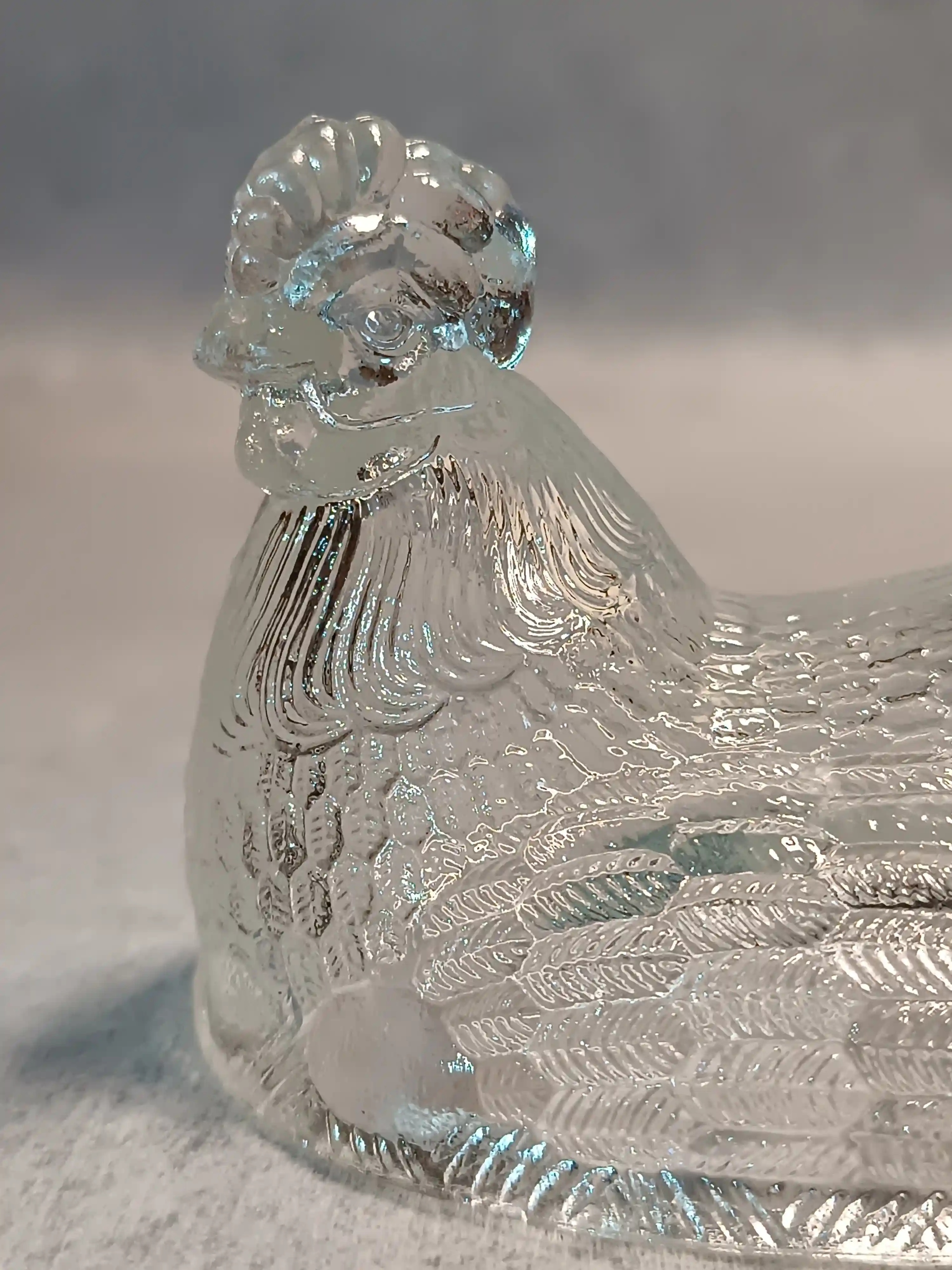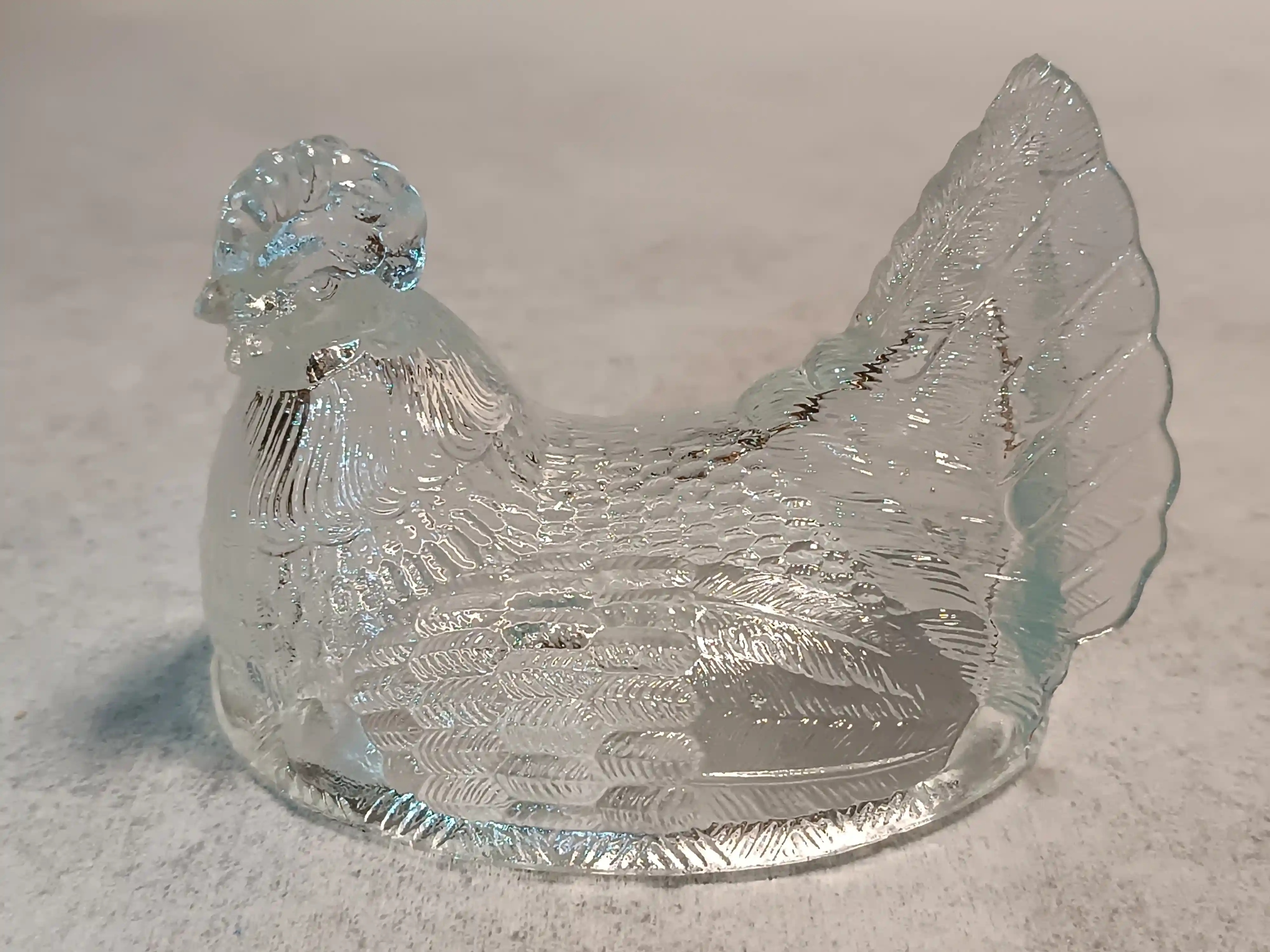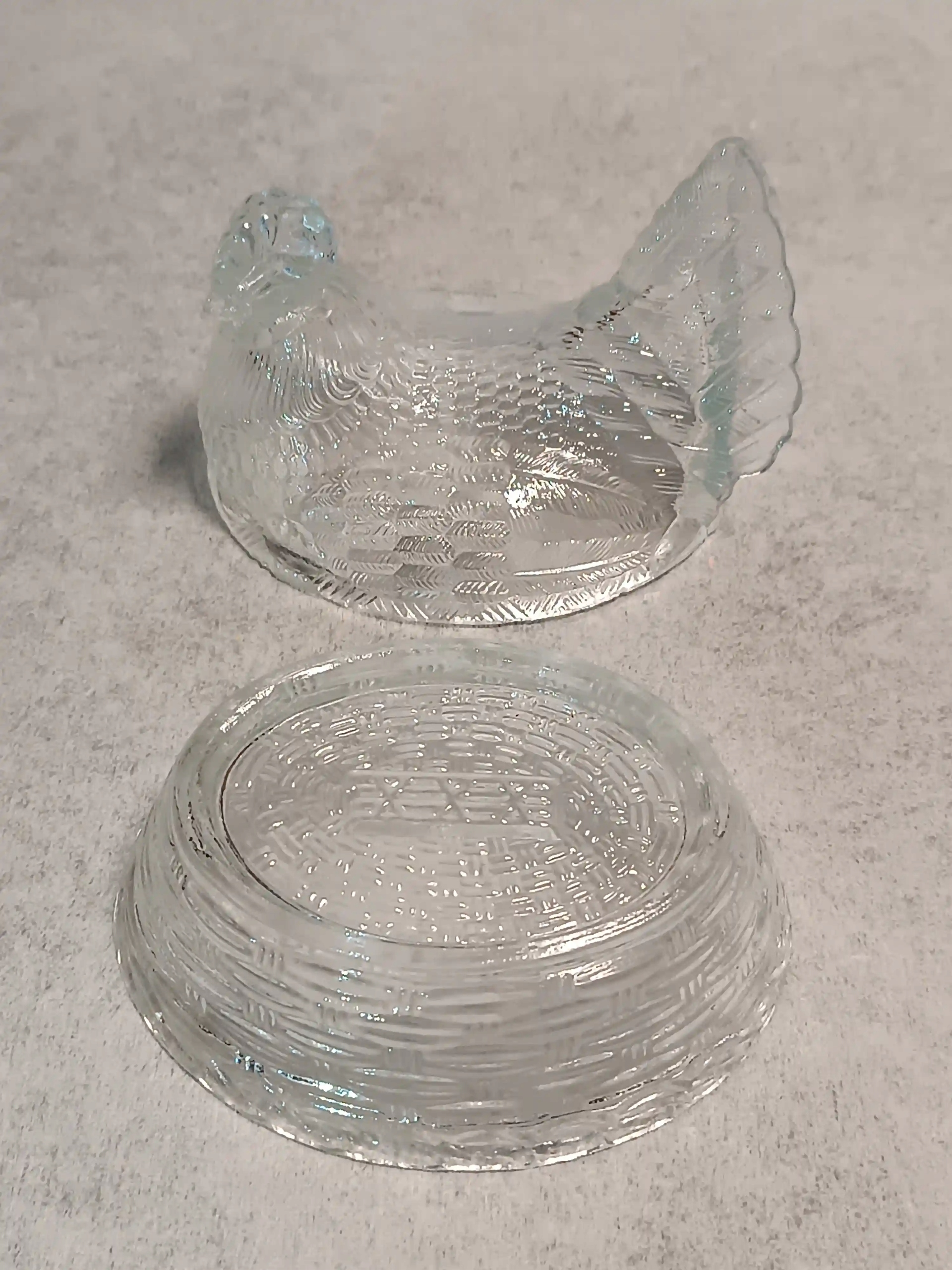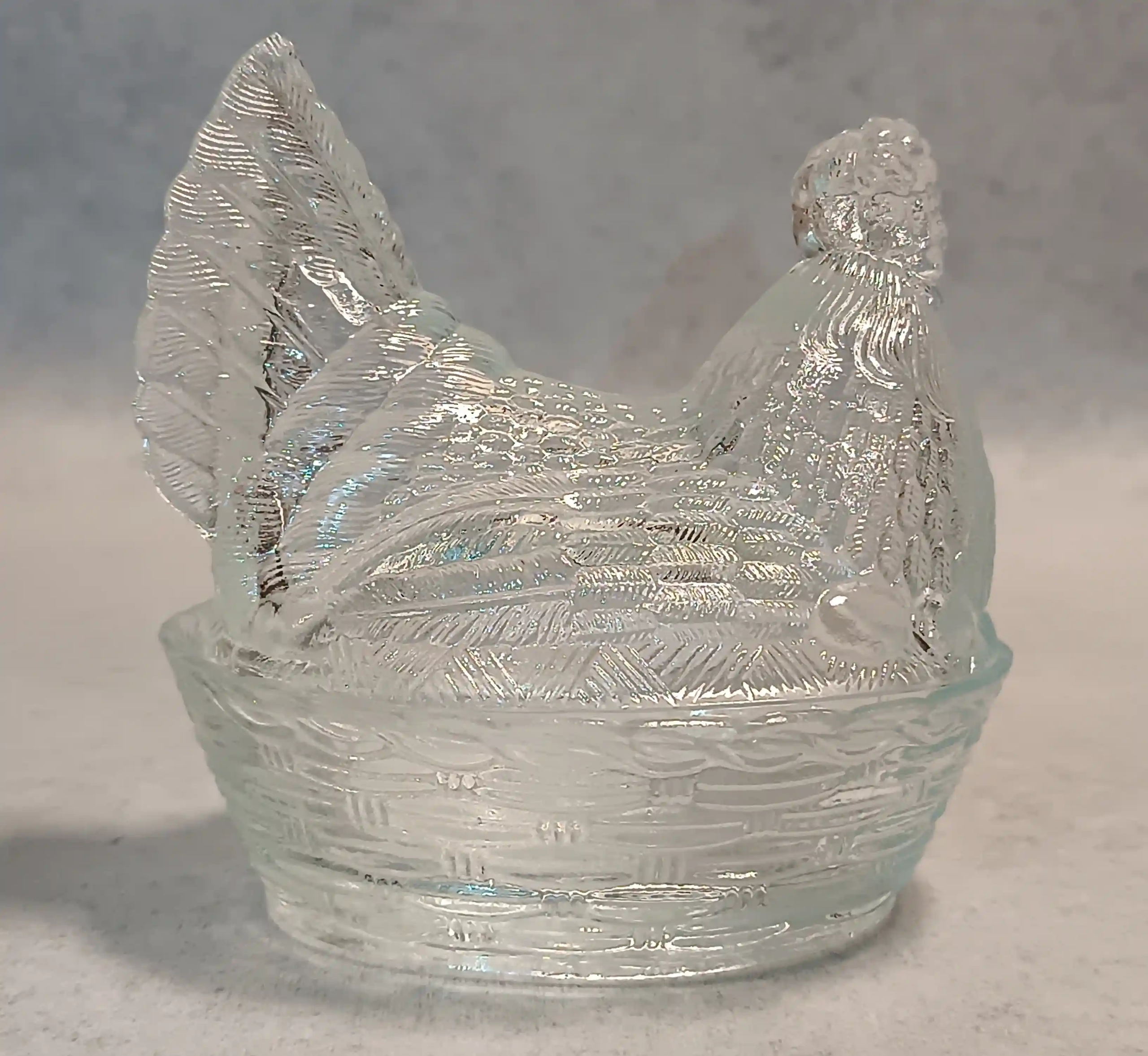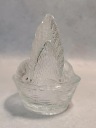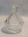 - стеклянный контейнер, известный как bomboniera или масельница, в уникальной форме курицы на корзинка.