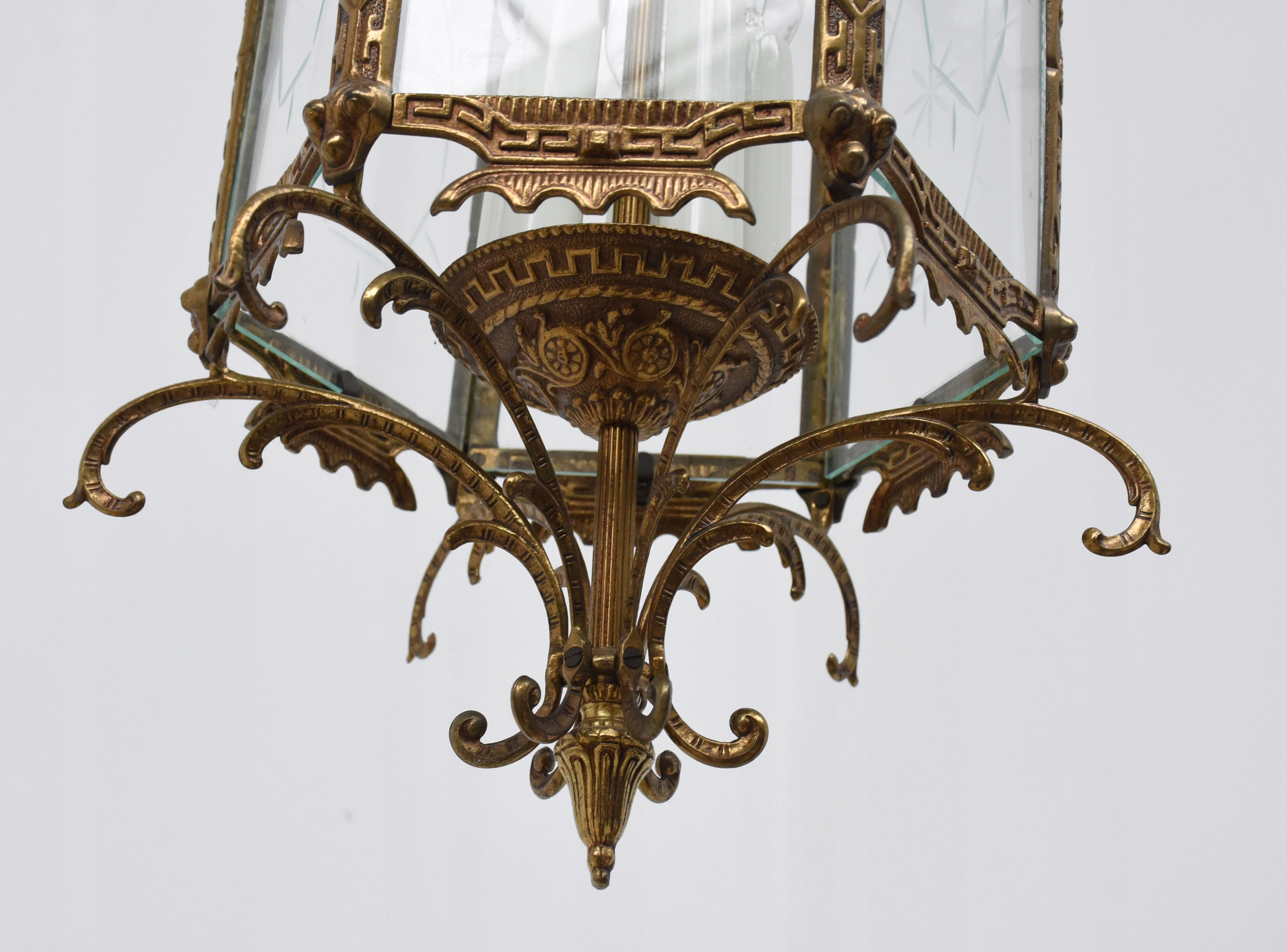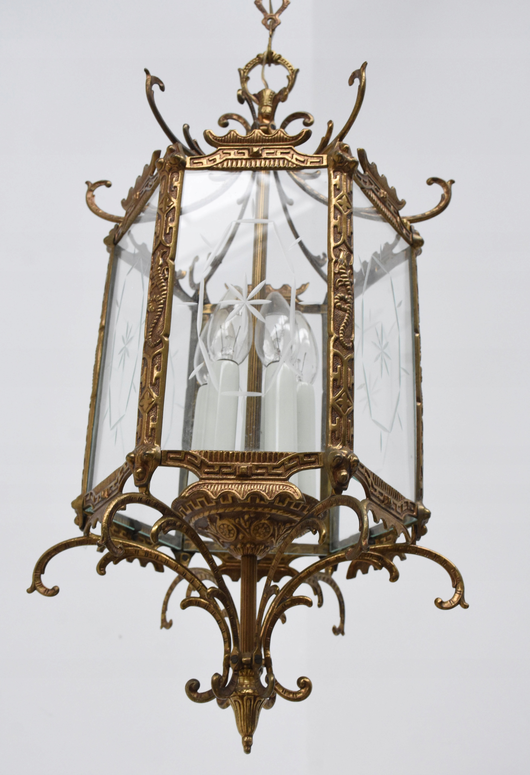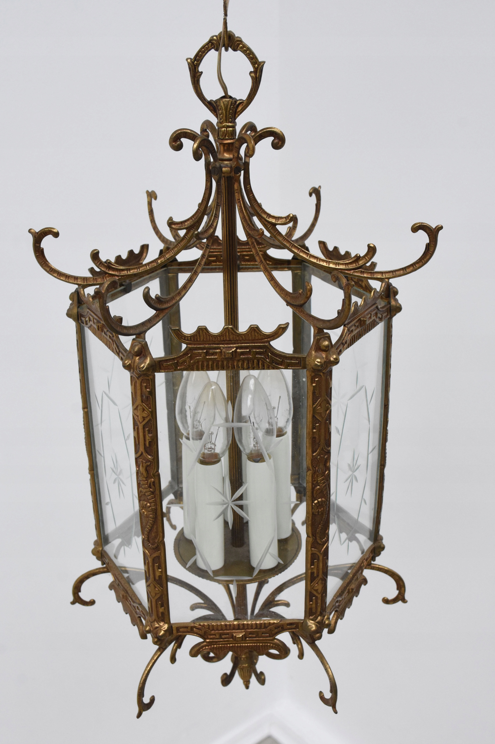 Żyrandol, pochodzenie Francja, wykonana z mosiądzu oraz szklanych wstawek, posiadający przepiękne kształty, posiada 5 punktów świetlnych,mały gwint