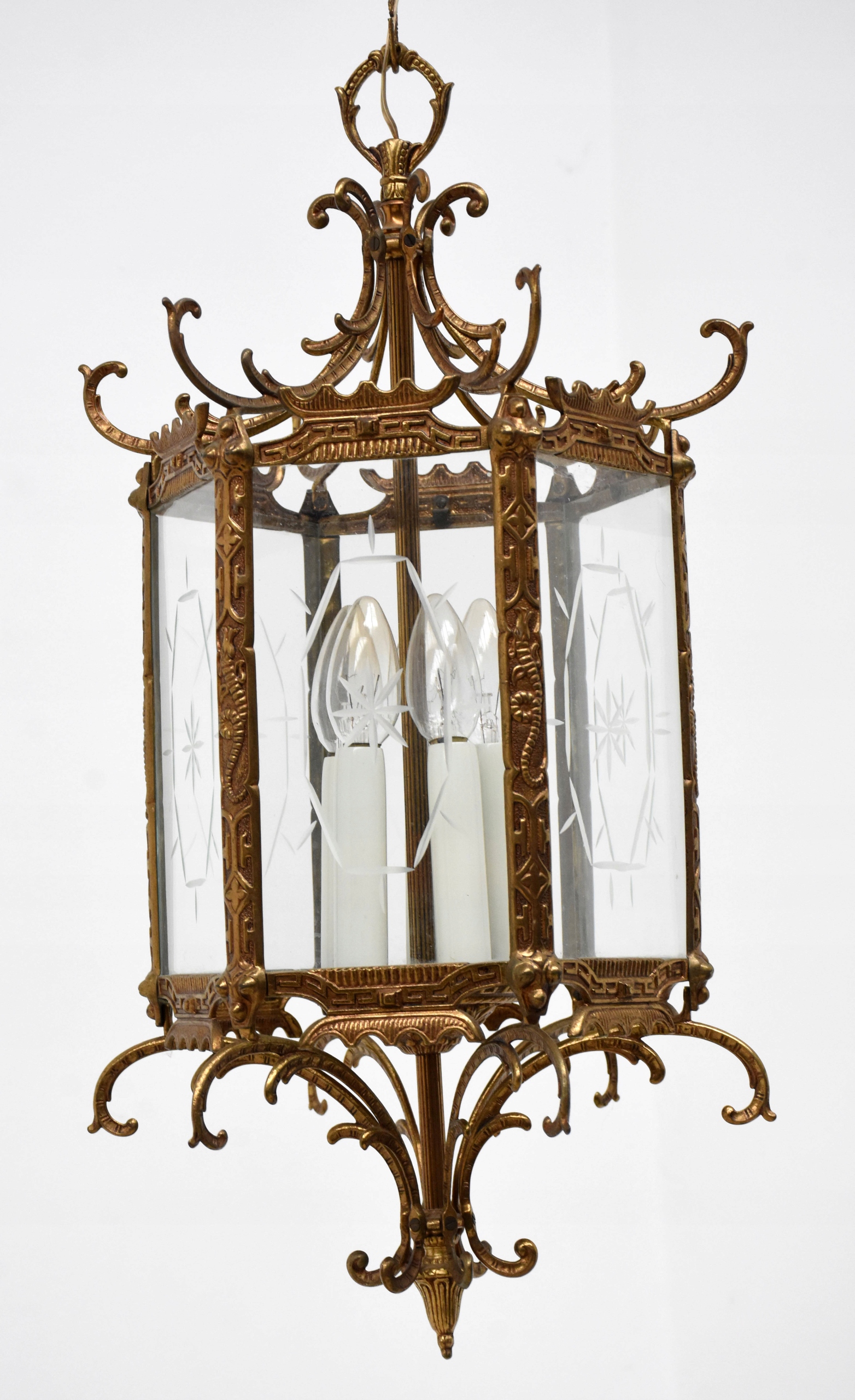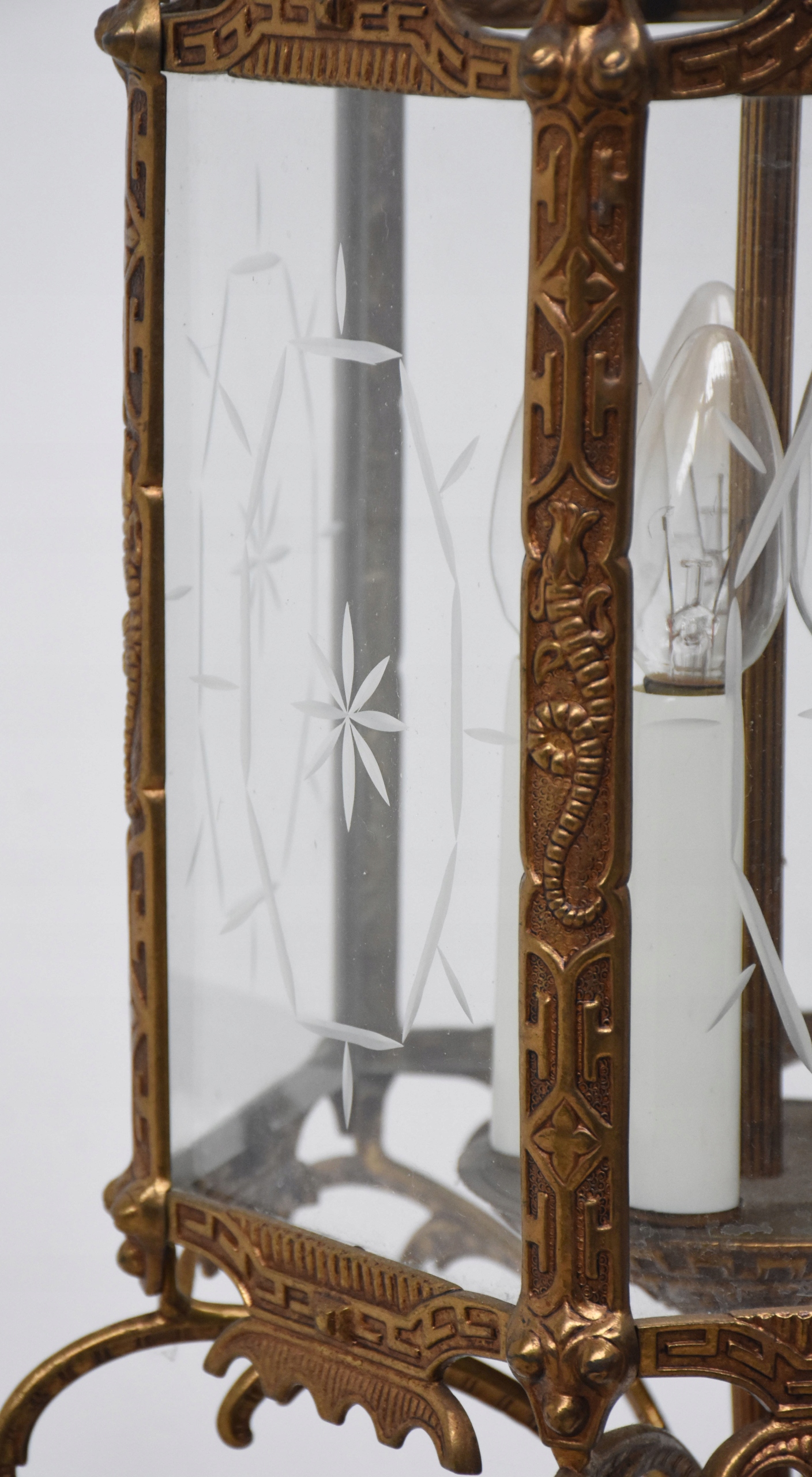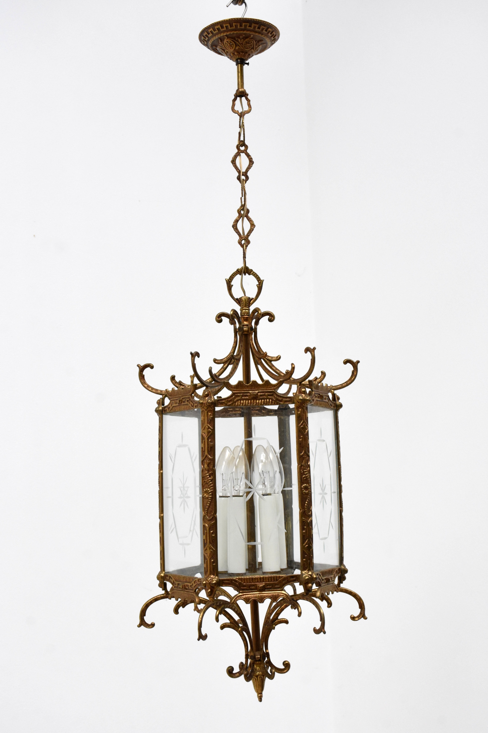 Żyrandol, pochodzenie Francja, wykonana z mosiądzu oraz szklanych wstawek, posiadający przepiękne kształty, posiada 5 punktów świetlnych,mały gwint