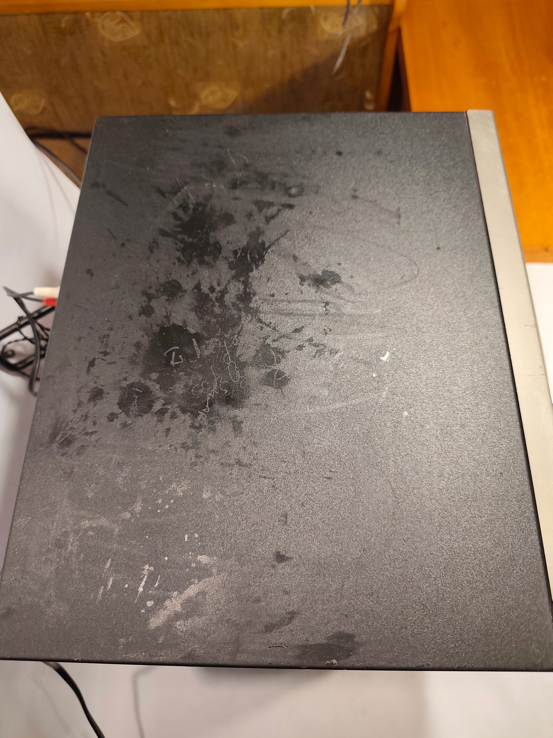 Góra pokrywy od CD i bok mają jakieś zacieki lub były pomalowane częściowo czarną farbą.