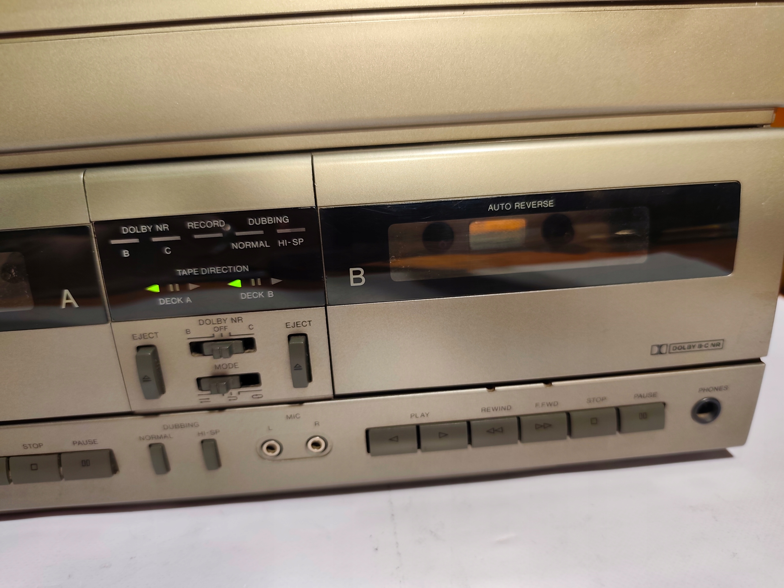 Tuner radiowy odbiera stacje radiowe na Fm w stereo ale nie działa wyświetlacz dlatego nie widać jaka stacja gra. Magnetofon kasetowy nie odtwarza. Nie przewija na żadnej kieszeni. Prawdopodobnie rozpuściły się paski klinowe ze starości. Można dokupić na allegro. Poza tym, z prawej kieszeni wyleciała jakaś mała sprężynka którą dołączam do zestawu.
