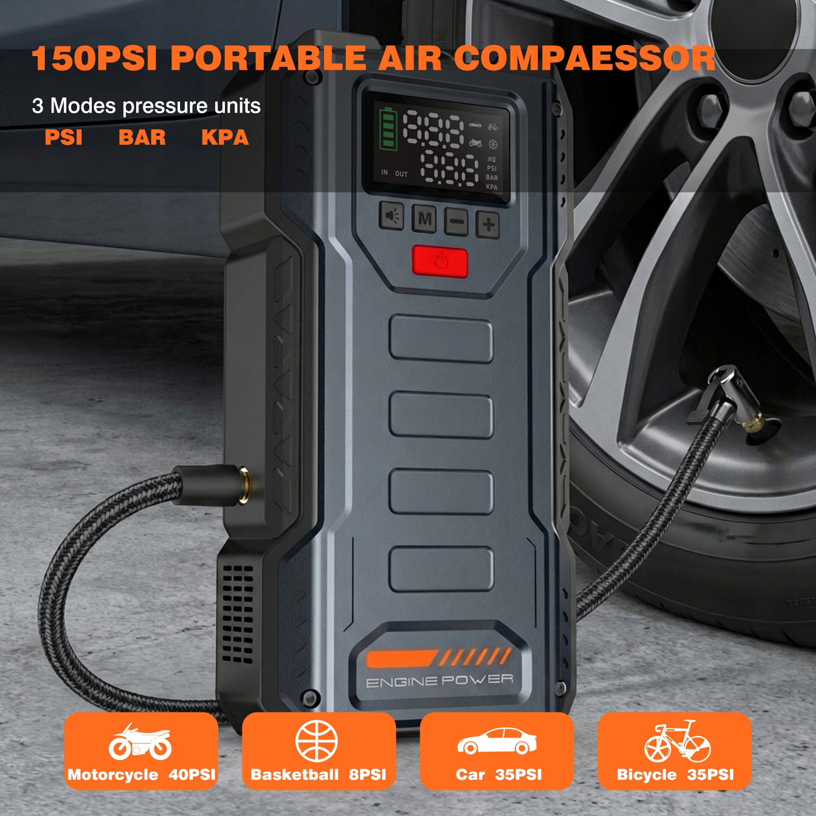 Zintegrowany kompresor cyfrowy zmienia zasady gry. Ekran LED zapewnia zalecane ustawienia wstępne PSI dla różnych scenariuszy – samochodów, motocykli, rowerów, piłek do koszykówki i innych. Możesz także ręcznie ustawić żądaną wartość ciśnienia dla innych pontonów. Dzięki maksymalnemu ciśnieniu 150 PSI (≈10.3 BAR) spełnia zdecydowaną większość Twoich potrzeb inflacyjnych, zapewniając optymalne ciśnienie w oponach dla bezpieczeństwa i oszczędności paliwa w dowolnym miejscu i czasie.