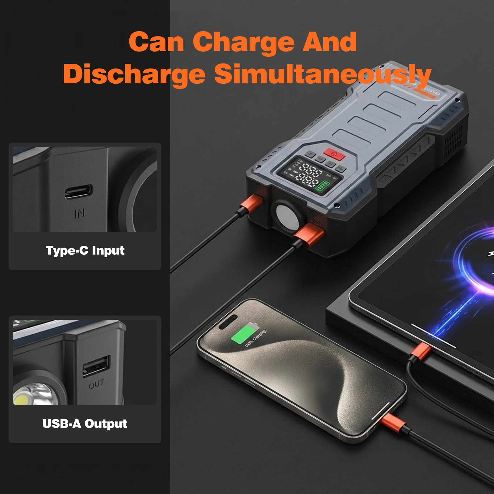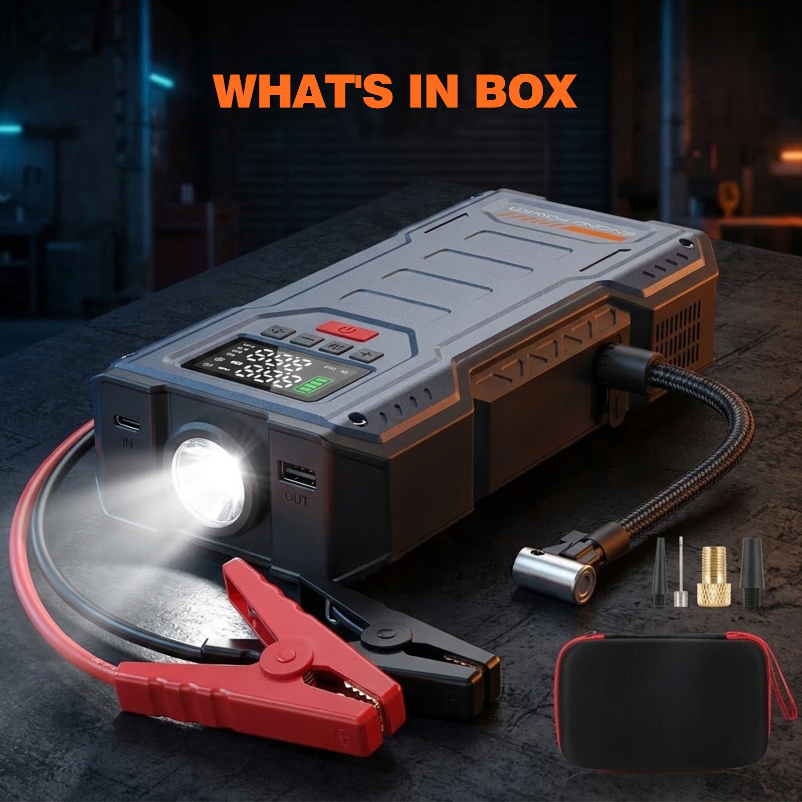 SWAREY W170 to więcej niż zwykły jump starter. To Twój kompleksowy towarzysz przydrożny, integrujący pięć niezbędnych funkcji w jednym przenośnym urządzeniu: potężny Jump Starter, szybko ładujący się Power Bank, precyzyjną sprężarkę powietrza i monitor ciśnienia w oponach oraz jasną latarkę LED.
