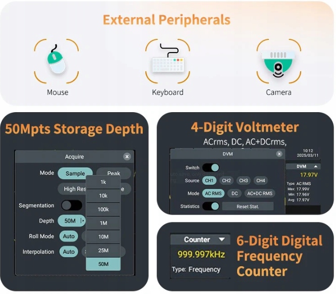• Tryby akwizycji: Sample, Peak, High Resolution, Average, Segmentation