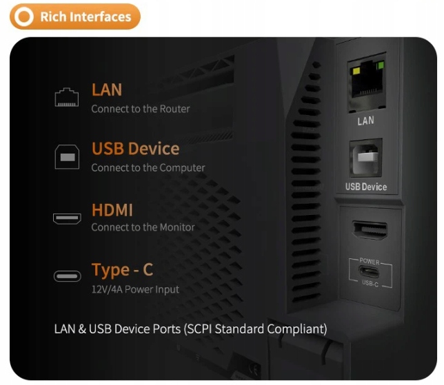 • Interfejsy: HDMI, USB Device, USB Host, LAN, Trigger Out (Pass/Fail)