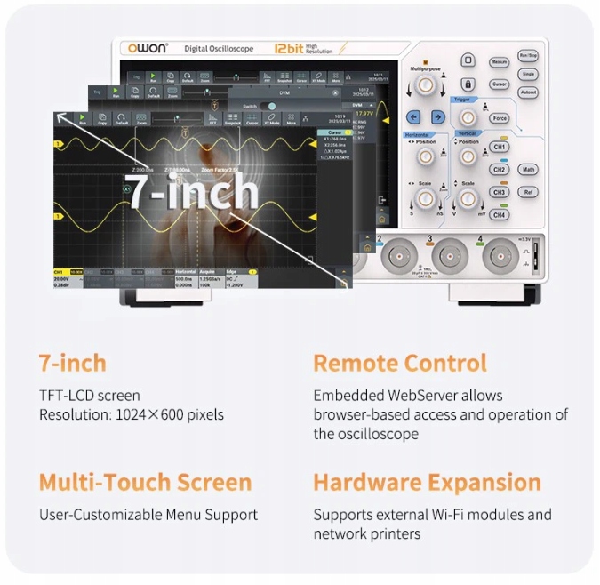 Model ten integruje w sobie funkcje oscyloskopu, licznika częstotliwości, woltomierza oraz analizatora widma FFT. Wyposażony jest w 7-calowy ekran dotykowy o rozdzielczości 1024x600, co w połączeniu z ultra-cienką obudową (78 mm) zapewnia wygodę pracy w każdych warunkach. Pamięć akwizycji wynosząca 50 Mpts oraz szybkie odświeżanie przebiegów do 700 000 wfms/s gwarantują skuteczne wychwytywanie rzadkich zdarzeń i anomalii. Oscyloskop obsługuje również zaawansowane wyzwalanie i dekodowanie magistral szeregowych (RS232, I2C, SPI, CAN, LIN).