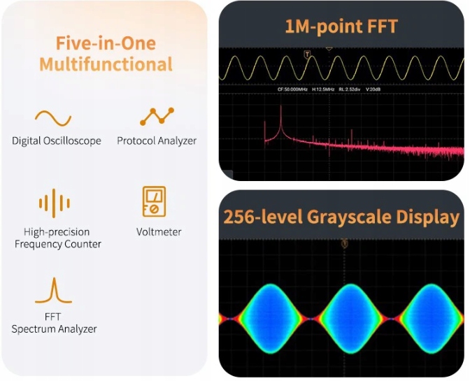 Obsługuje okna powiększenia (Zoom), tryby FFT i XY, z bardziej intuicyjnymi informacjami o pomiarach kursorowych
