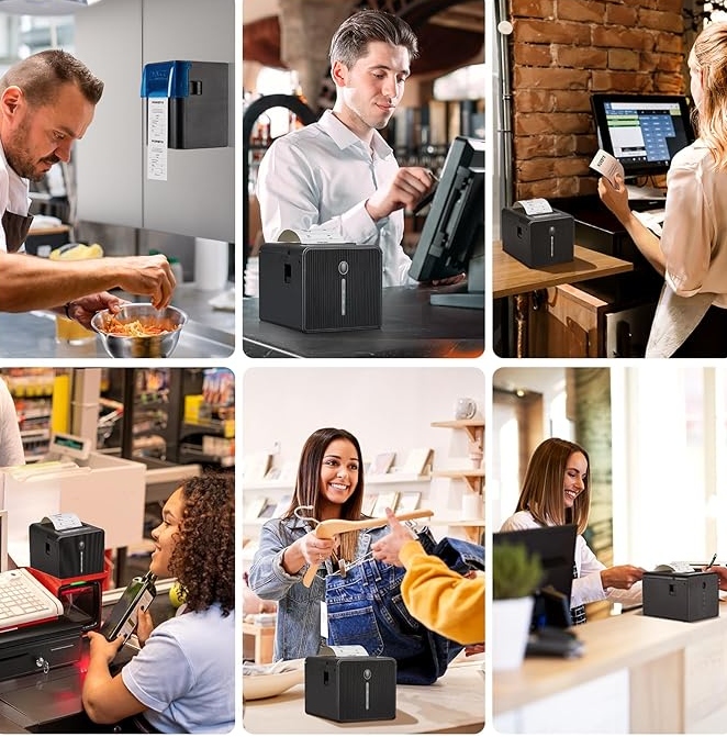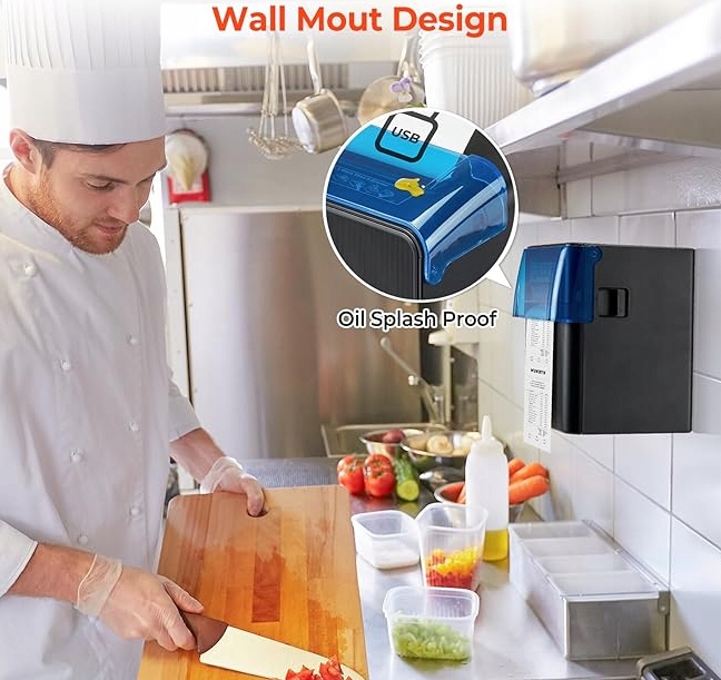 【Montowana na ścianie olejoodporna osłona 】: Dwa otwory wiszące na dole. Opcje montażu na ścianie / stojaku dostępne, aby zaoszczędzić miejsce. Góra jest wyposażona w oleodporną czapkę dostępną w dwóch kolorach (niebieskim / czarnym), aby chronić pokwitowania nawet w trudnych warunkach. Duża pojemność, dzięki czemu łatwiej zmienić papier. Alarm brzęczyka pozwala nigdy nie przegapić zamówienia nawet w hałaśliwych środowiskach!