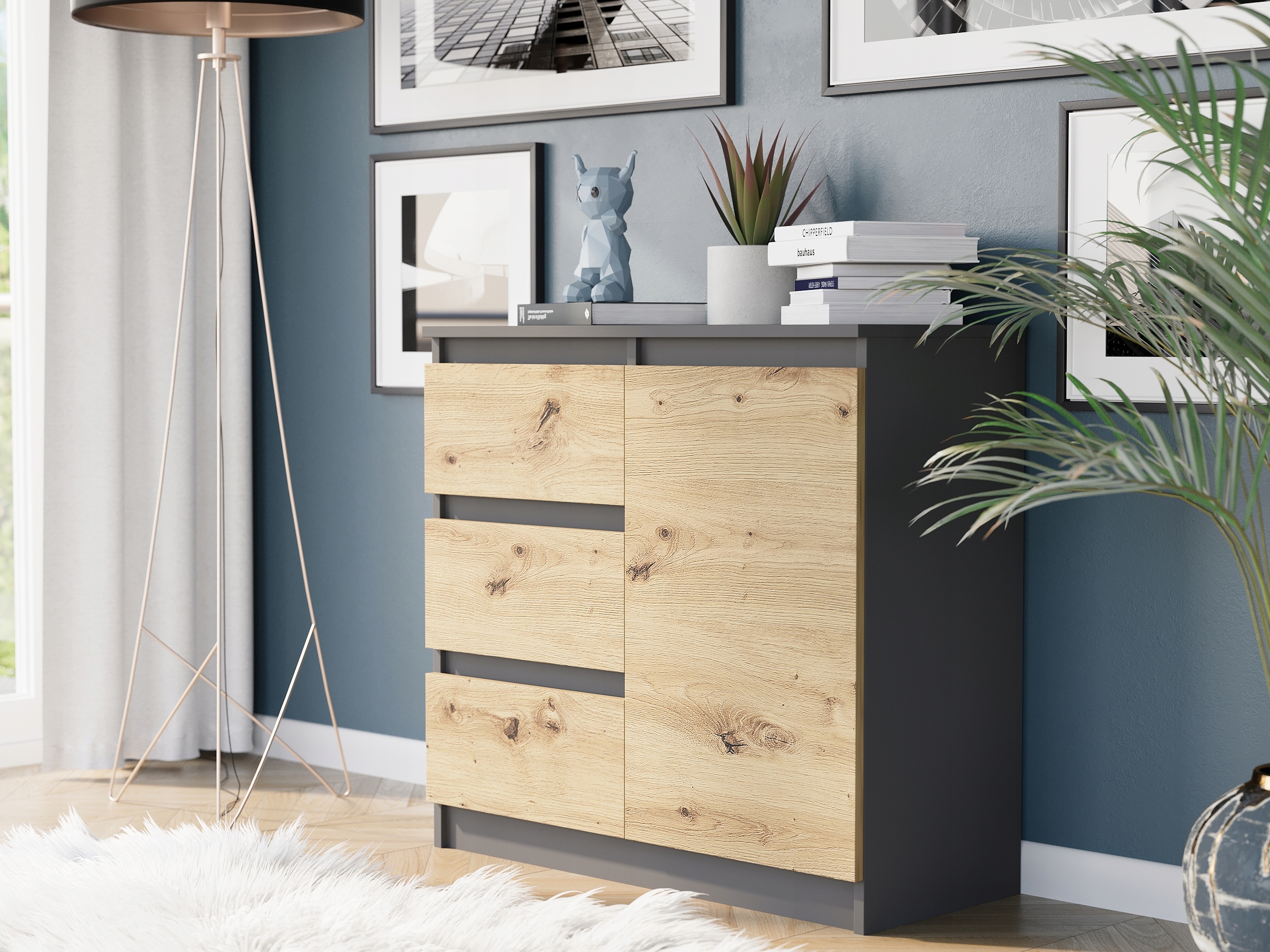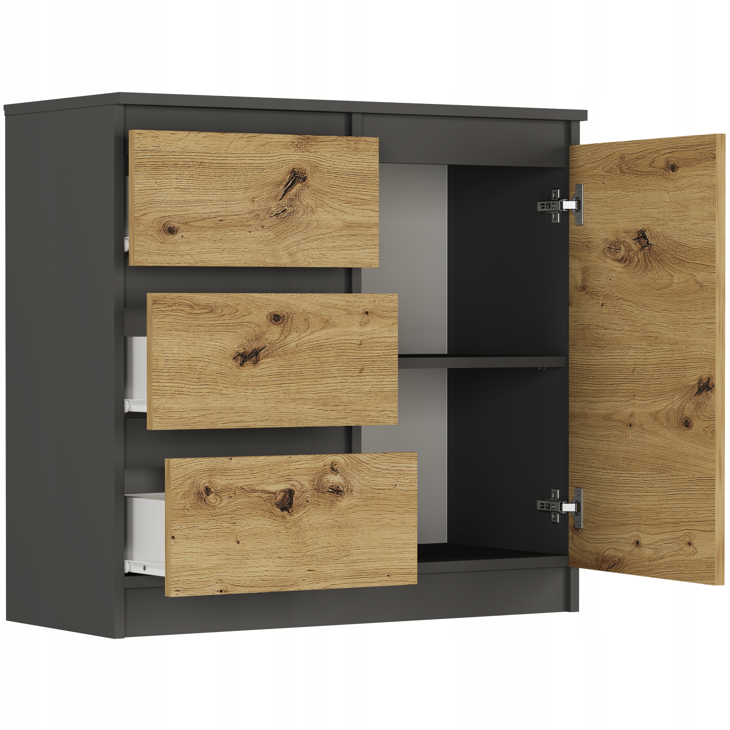 Комод предлагает практичное место для хранения благодаря вместительным шкафам и ящикам, которые помогут поддерживать порядок в в помещении.