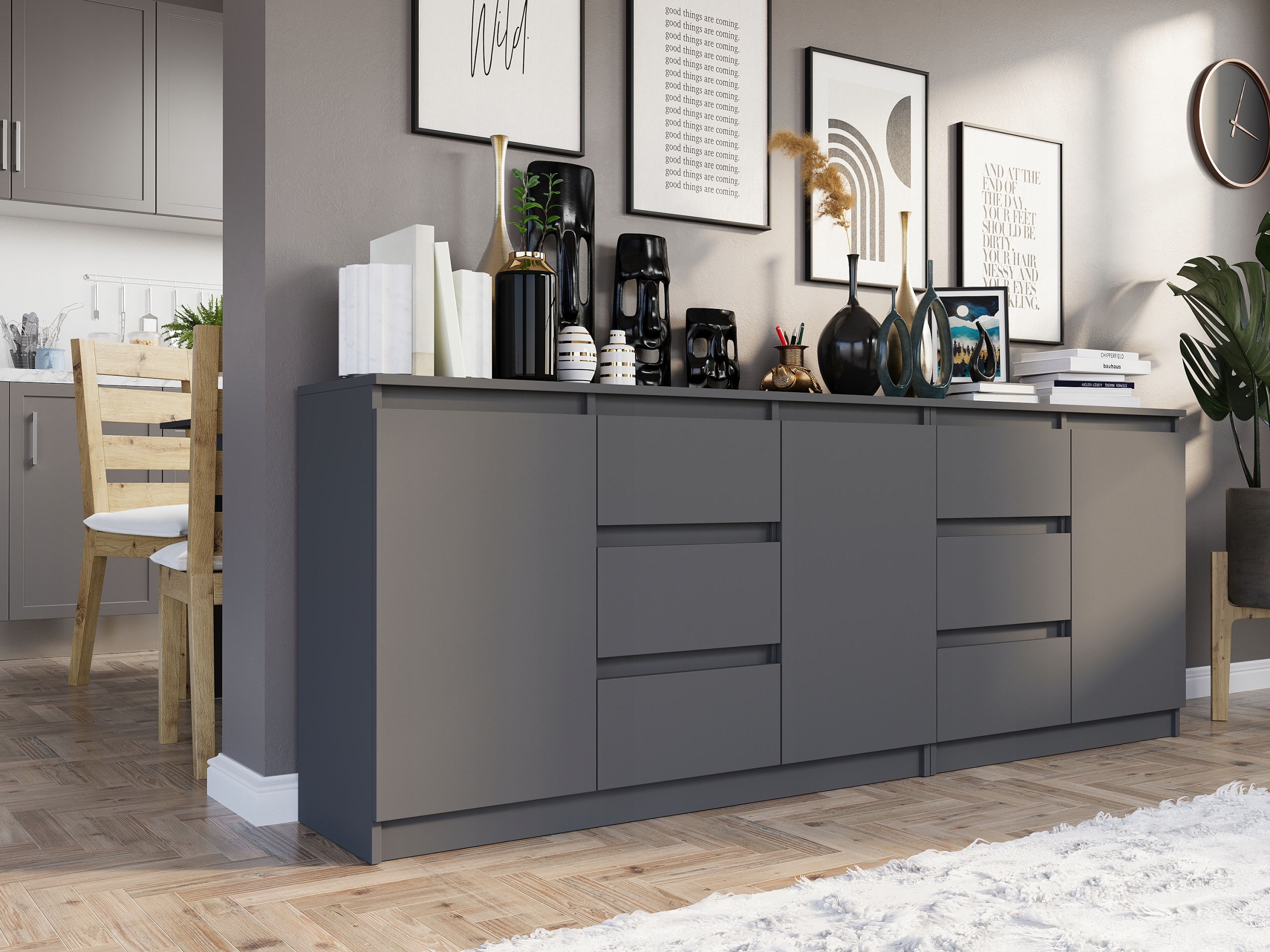 Komoda stanowi połączenie dwóch modułów o szerokości 120 cm oraz 80 cm, co daje łącznie aż 200 cm szerokości – idealne rozwiązanie dla osób potrzebujących dużo miejsca do przechowywania.
